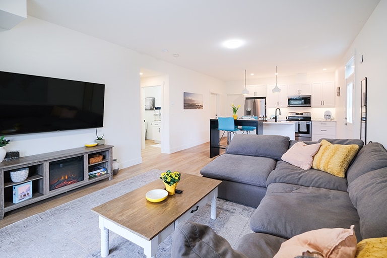 In a quiet suburban neighbourhood, a renovated, modern, clean suite with: 1 private BR w/ 1 queen bed, 1 queen sofa bed, 1 bathroom w/ tub, a full kitchen, and a laundry room. A five minute drive to downtown Duncan. There is a private entrance with a patio, and a parking spot outside your door. A heat pump, and a carbon and HEPA filter air purifier are installed for climate control. The tv has Netflix, Amazon, and Disney+. We are a small family who lives upstairs. Business Licence #00107897