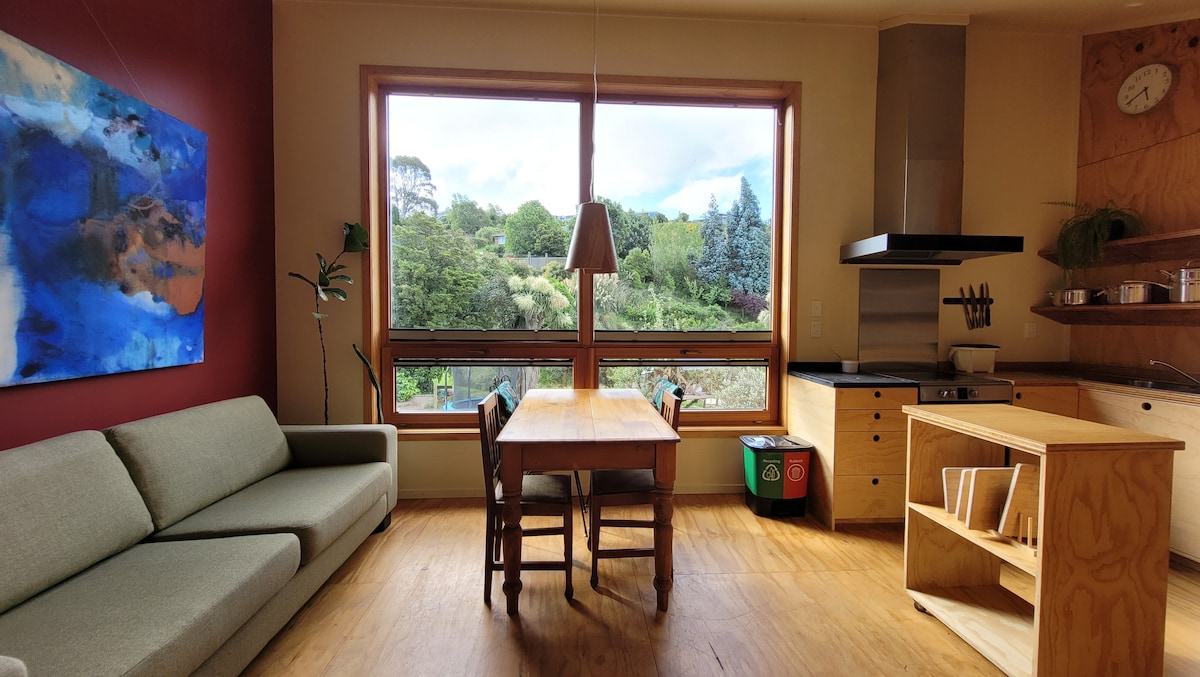 Enjoy modern comfort in this cozy private guesthouse. Perched atop a one-car garage, its position high above a quiet residential street gives this tiny house a very private feel. Large double glazed windows on three sides and a spacious private deck provide sweeping views of Otago Harbour & Peninsula, walking distance from the city centre.