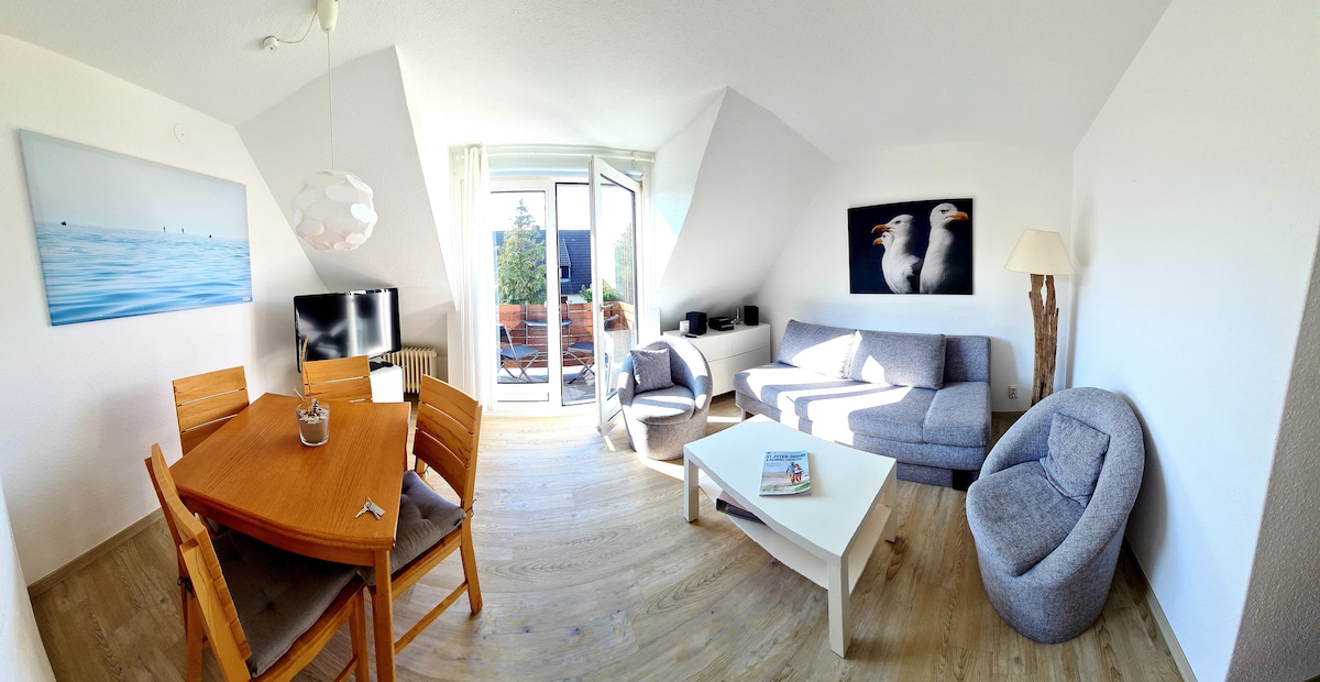 Wir vermieten ein gemütliches, kleines 1-Zimmer App. mit 25 qm. In dem Wohnraum befindet sich auch das Schrankbett (180X200). Die Küche ist mit Kühlschrank ,Spülmaschine, Kaffeemaschine, Toaster, Mikrowelle ausgestattet. Duschbad. Der großzügige Balkon lädt zum Sonnenbaden ein. Die Lage ist toll, du bist 200m vom Deich entfernt und es sind 400m zur Seebrücke und zu Gosch. Für Yoga Fans! Das Kubatzki Hotel liegt 100 m entfernt und das neue Hotel Urban Nature ebenfalls ca. 100 m entfernt.