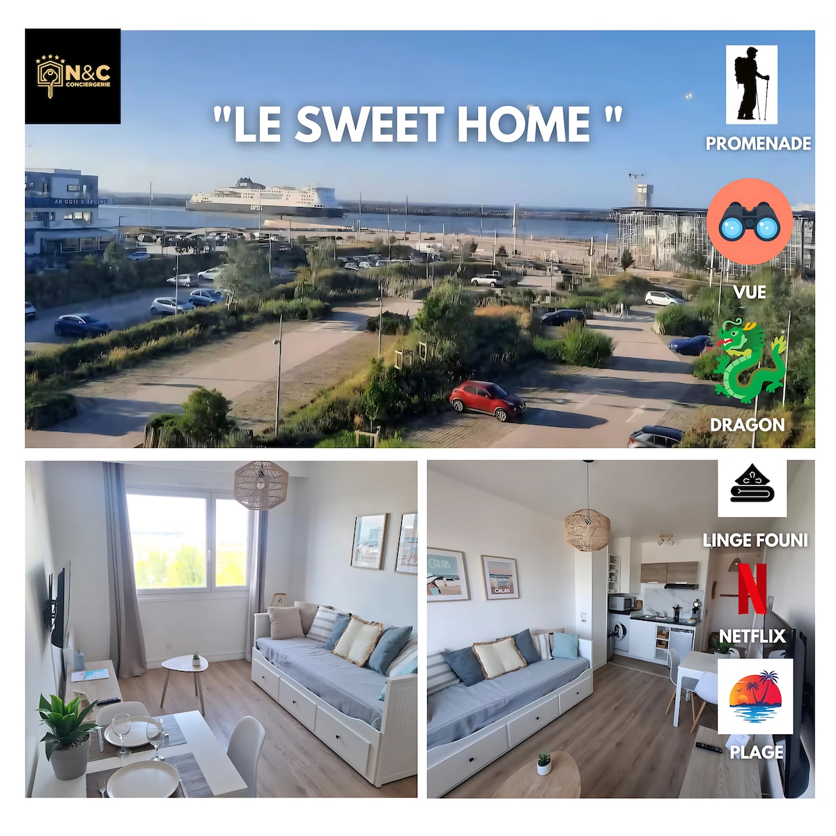 Nice Calais beach studio with private parking and bike storage 25m2 studio (3 people) located in a pleasant, secure residence with caretaker 50 meters from the beach. 4th and last floor with elevator, located due south, very sunny with open view minimarket at the bottom of the residence, bakery, pharmacy, bars, newsagent, restaurants, gourmet village (ice cream, chip shop, snack bar) 200m. The Dragon de Calais is located at the end of the street 200m away with a view of the harbor entrance