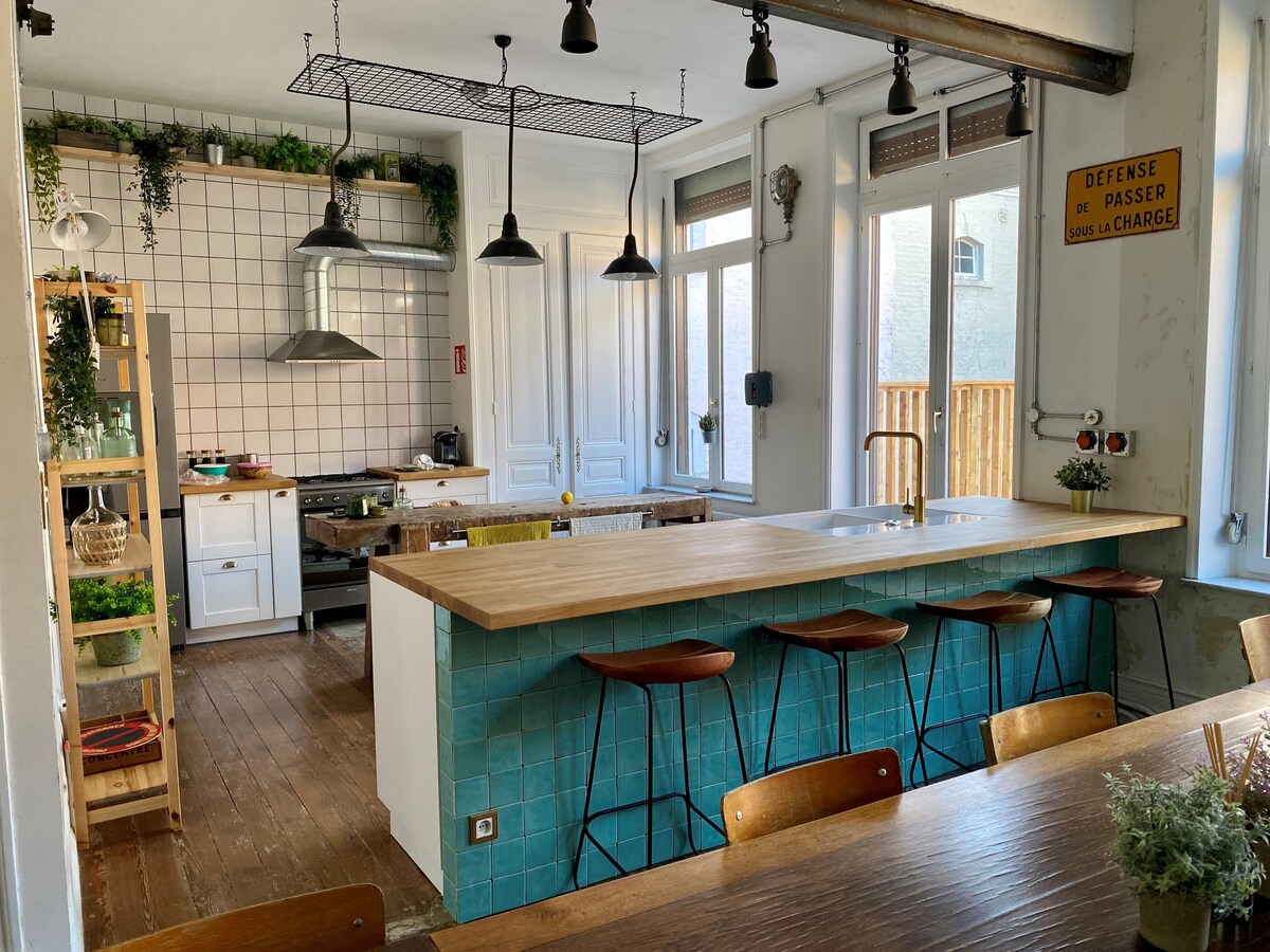 Situé dans le centre de Dunkerque (500m de la place Jean-Bart), ce vaste appartement au style bohème chic / industriel est l'unique habitation d'un immeuble de caractère (ancienne brasserie dunkerquoise). Doté d'une terrasse panoramique de plus de 70 mètres carrés, six chambres (dont deux avec sdb et WC intégrés), deux salles de bains, il se situe à 10 min à vélo de la plage, 15 min à pied de la gare, 5 min à pied de la place Jean Bart.