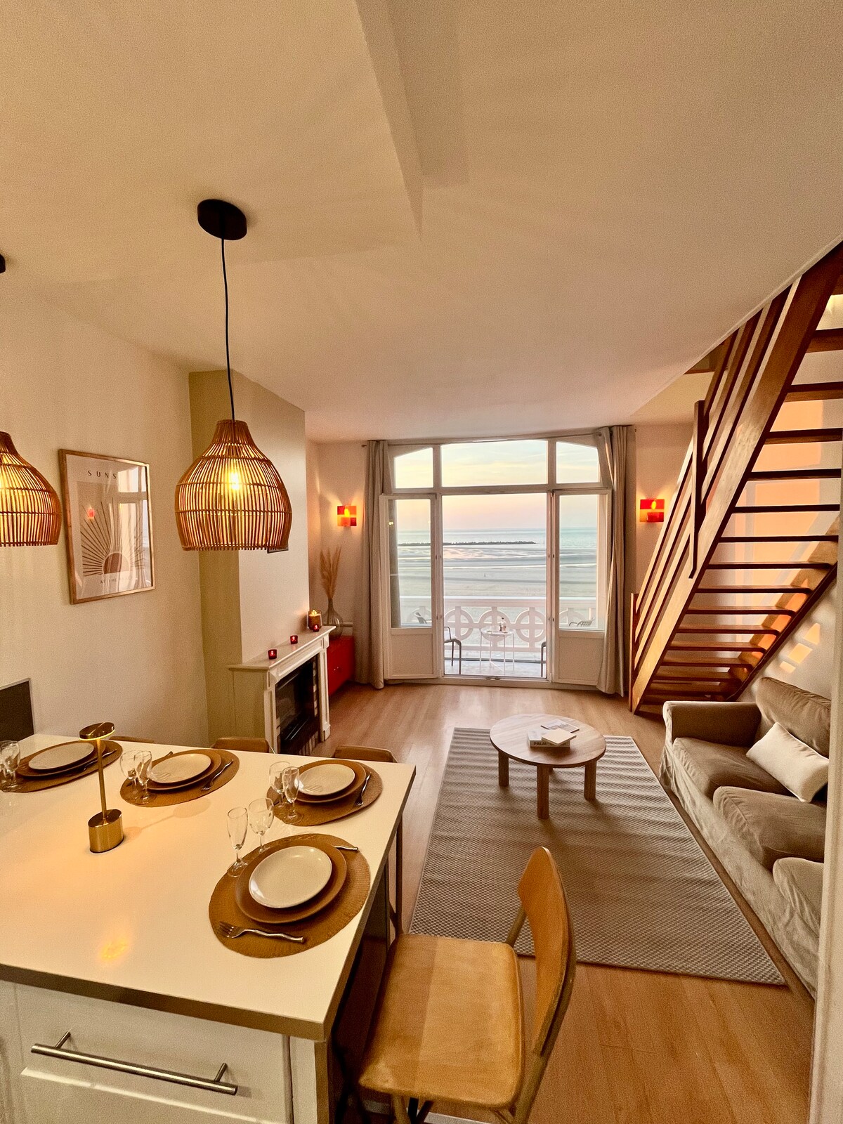 Face à la mer, passez un agréable séjour dans ce charmant duplex, situé au 4ème étage d’une Malouine. Bénéficiez d’un emplacement central sur la Digue de Malo et ses activités sportives et culturelles. - Pièce à vivre, cuisine équipée, salon - Balcon en front de mer - Chambre 1 à l’étage: 1 lit 160 x 200cm, placard, commode - Chambre 2 : 1 lit 80 à 160 x 200cm, placard - Salle de douche, vasque et WC - Lit bébé, baignoire et chaise haute sur demande - Draps et serviettes fournis