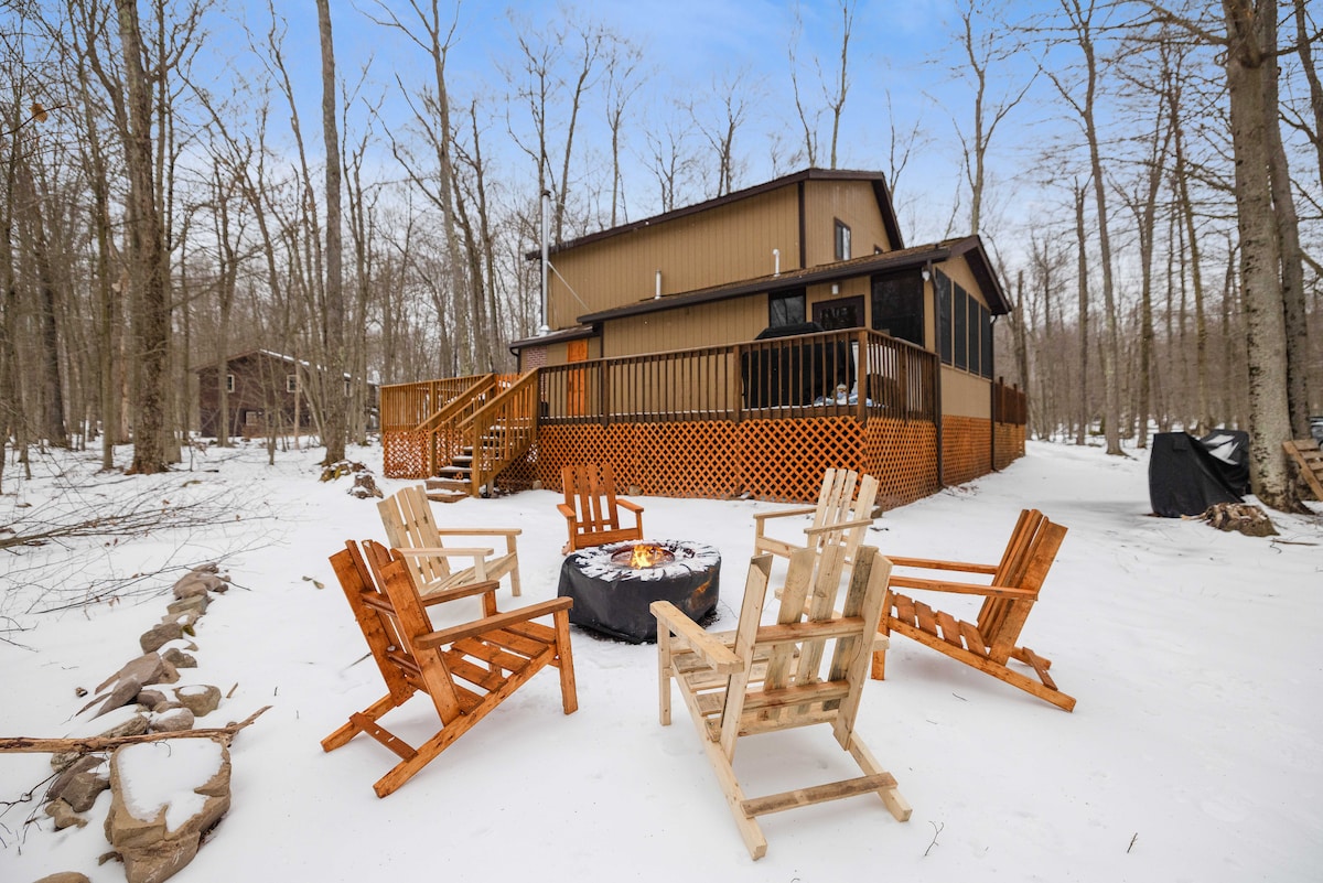Relax in nature when you stay at this restful retreat situated on 2 quiet acres of calm wooded wonderland. The 2-bed, 1-bath cabin accommodates up to 8 guests. Spacious living room and ample kitchen space make sure that entertaining your group is a breeze. Outdoor deck with grill for BBQ nights. The covered front porch is ideal for watching the wildlife pass through the property. Cozy up next to the fire pit for s'more fun! Enjoy exploring all that the Poconos has to offer when you stay here!