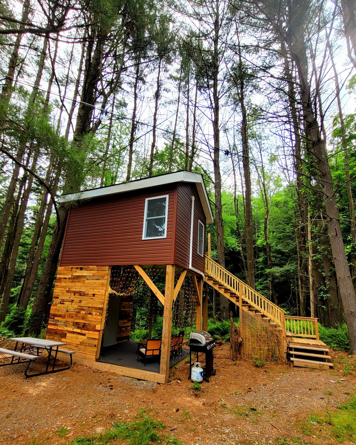 Welcome to Treetop Getaways Luxury Treehouse Campground! We are the only one of its kind! Come enjoy a night in the trees at this absolutely gorgeous freestanding treehouse. This beautiful little 200 sq ft rustic cabin in the air, has absolutely everything you could ever want from your vacation including a pull out sofa bed and a regular bed, hot and cold running water, regular toilet, everything you need to cook, Wi-Fi, TV, and the most comfortable bed you've ever slept in.