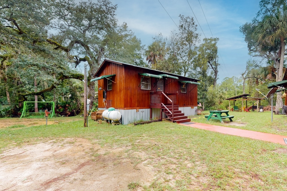 Feel the good vibes on this one-acre retreat. Beautiful trees surround the Cabin & off-grid Hobbit home. The stylish 3-bedroom / 2 bath cabin. Magical outdoor living space for relaxation & connection. Hot tub, fire pit, griddle, corn holes, hammock. Rent the golf cart. Bring or rent a boat to explore the Withlacoochee River, Rainbow River, or Lake Rousseau (boat launch just down the street). The clear blue Rainbow River Spring is a short drive away (rent kayaks & swim at the state park).