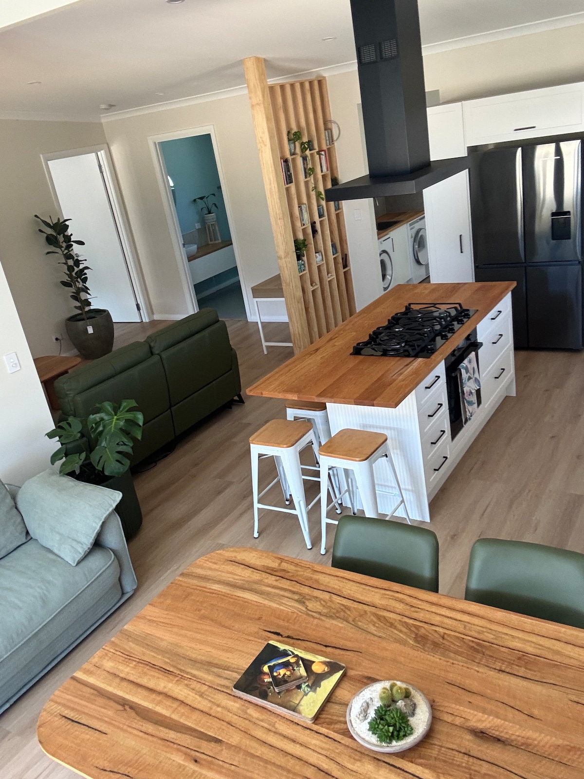 The cottage is open style living opening on to a decking with bi fold servery windows from the kitchen.Decking with outdoor seating ,umbrella and barbecue overlooks a large grassed area surrounded by natural bush.The living area has double opening doors leading to the decking .Living area has a comfy couch ,Smart T.V , R/C aircon and a wood burning fire.The large bedroom has a king sized bed with ensuite .There is a travel cot suitable for a baby.Well supervised dogs are welcome. Starlink WiFi