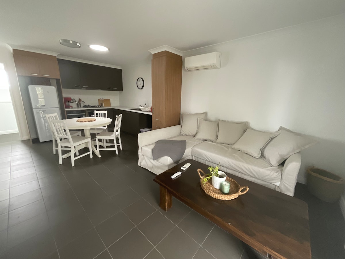 Kick back and relax in this calm, stylish space. Self-contained accommodation with own entrance. 1 bedroom, 1 bathroom, kitchenette, lounge with TV and dining suite closed off from main house with sound resistant walls. Opposite Dunsborough Lakes golf course in quiet street. Kitchenette has bar fridge (milk provided), microwave, induction hot plate, coffee pod machine with Nespresso pods, kettle, toaster, ducted A/C, water filtration, weber BBQ, sensor lights for guests. Laundry access if reqd.