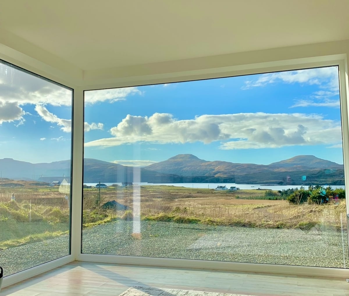 Gael is a modern cabin on a working croft, which captures uninterrupted views over Portree bay, Ben Tianavaig and the Cuillin hills in the far distance. The cabin itself has a full height atrium which includes a functional kitchenette, seating area, log-burner and a three-piece bathroom suite. The mezzanine level is accessed by a wooden staircase featuring a comfortable double bed. Situated just off the Scorrybreach trail this is the perfect launchpad for your Skye adventure.
