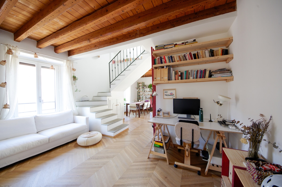 A stylish, bright loft ideal for travelling people, professionals/remote workers and leisure guests alike. 60 sqm with exposed beams and private terrace. Very fast Wi-Fi 1 Gbps fiber, large table desk, comfortable workspace, AC and modern comforts. Situated in a trendy, cosmopolitan area, full of Art Nouveau architecture, independent cafés, design bars, and international restaurants. Just a few minutes walk from Corso Buenos Aires, one of the longest shopping streets in Europe.