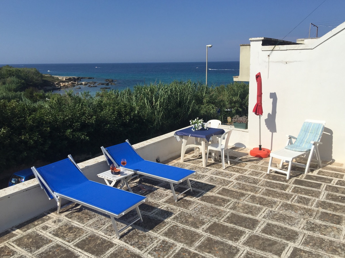 Comfortable beachfront apartment with 180 degree sea view from rooftop terrace and free parking right outside the front door. Aircondition, satellite TV and wifi. The apartment is one of two units in our house in the beach area of Otranto, about 50 meters from the water. Historic center on foot in just 10 minutes. Please note that there is an additional city tax to be payd on arrival, currently 1 euro per person (over 12) per night, in july and august 1,50 euro per person per night.