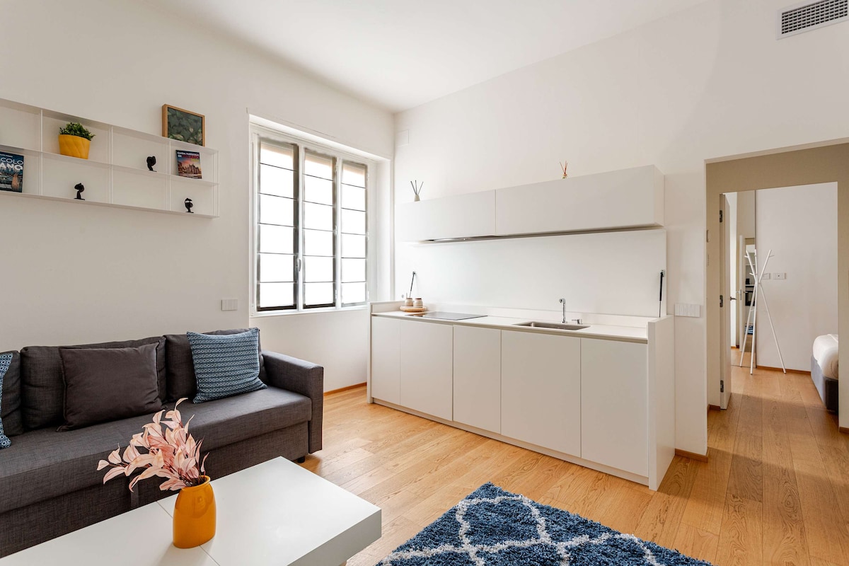 *Please check-in not accepted after 8.00pm* Prime Location: Newly renovated, intimate and quiet 45 sqm studio with separate bed and 1 bathroom in Old Brera District. Large windows to a beautiful garden view, wooden flooring throughout and Fully furnished. Extra bed on sofa bed. The flat is equipped with the fastest broadband unlimited internet available. It is conceived for tourists and Digital Nomads, and long term stays in general. It is the perfect place to spend a month or more in Milan!