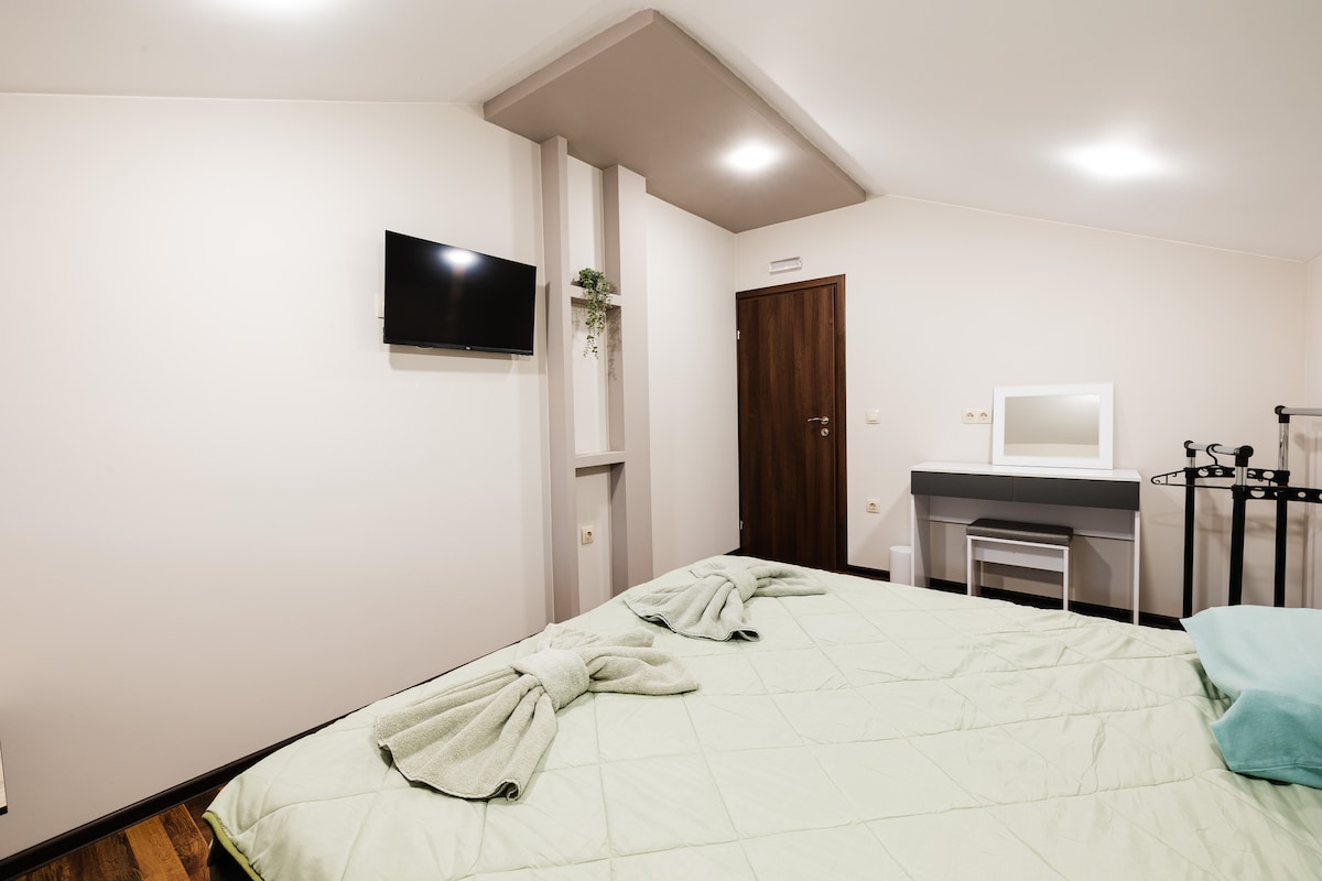 Mountain view rooms consists of a kitchen and two bedrooms each with a queen sized bed. One of the bedrooms overlooks the Rila mountains. Every room is perfect for two persons.