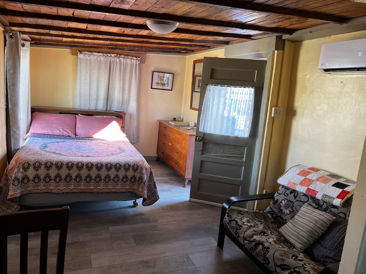 Just finished upgrades and renovation in January 2026 based on some disappointing reviews. New floors, fresh paint, new windows, under cabinet trim & beautification throughout. Enjoy your second story porch for sunbathing in our 350 sunny days per year! Walking distance to Mineral Baths, grocery, Restaurants & Shopping. Cozy, fun, intimate space with big porch & clawfoot tub in the kitchen! Double bed, single futon couch & full kitchen with a dining table. Large dresser and new mini split.