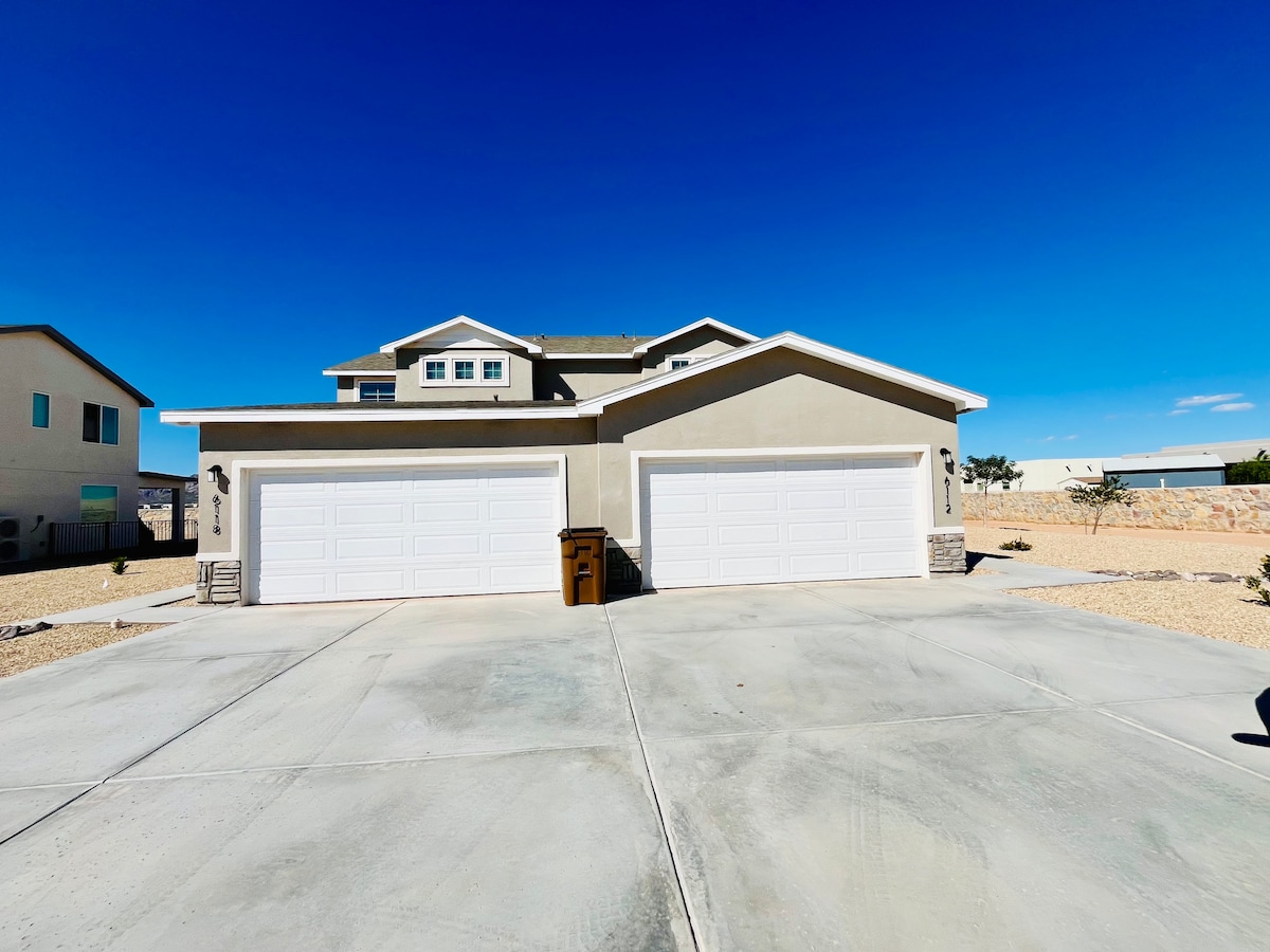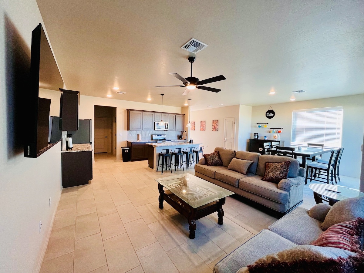 Brand new home, with a beautiful view of the Organ mountains located right across the street from a water park for unlimited free fun in the spring and summer and most park activities year round. Close to NASA and White sands missile range. 5 min. From the fwy & shopping ..10 min. From downtown. Incredible sunsets, peace and quiet, a place to recharge your batteries. New appliances.. gourmet kitchen..comfortable beds.. custom shower.. Private landscaped back yard...Your home away from home.
