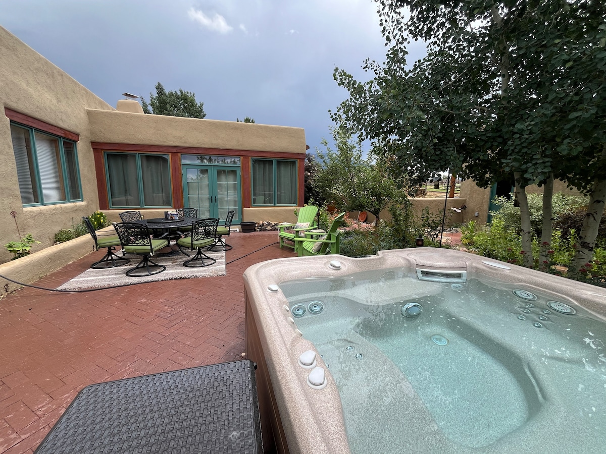 ✨ Romantic Sunflower Studio: peaceful spa sanctuary 🌲 1 mi to Plaza, 1.6 mi to Canyon Rd; off-street parking, private entrance, bath & fully stocked kitchen • 100% private hot tub (low-chemical) • Sauna + cold plunge spa circuit 🔥❄️ • Local chocolate truffles 🎁 • Projector for movie nights 🍿 • Organic coffee, tea & curated snacks ☕️ • Cozy robes • Mood lighting • Fast WiFi • A/C + heat • Green cleaning • 🐶 friendly ✨ Perfect for couples seeking a peaceful retreat minutes from the Plaza 🌻