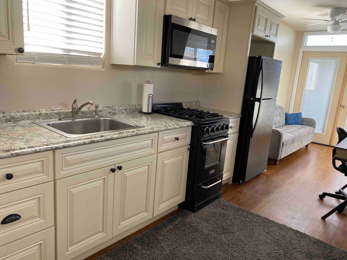 Welcome to our Shipping Container Casita, a tiny house in the heart of Old Town Albuquerque! We are located blocks from the Plaza, just off of historic Route 66! Our casita is fully furnished with luxury in mind, from a custom king sized bed, to a deep soaking tub, a private backyard with views of the Sandia Mountains, and unique efficient kitchenette with an easy to use Nespresso coffee maker for the perfect start to your day. We hope you’ll enjoy our New Mexican tiny house as much as we do!