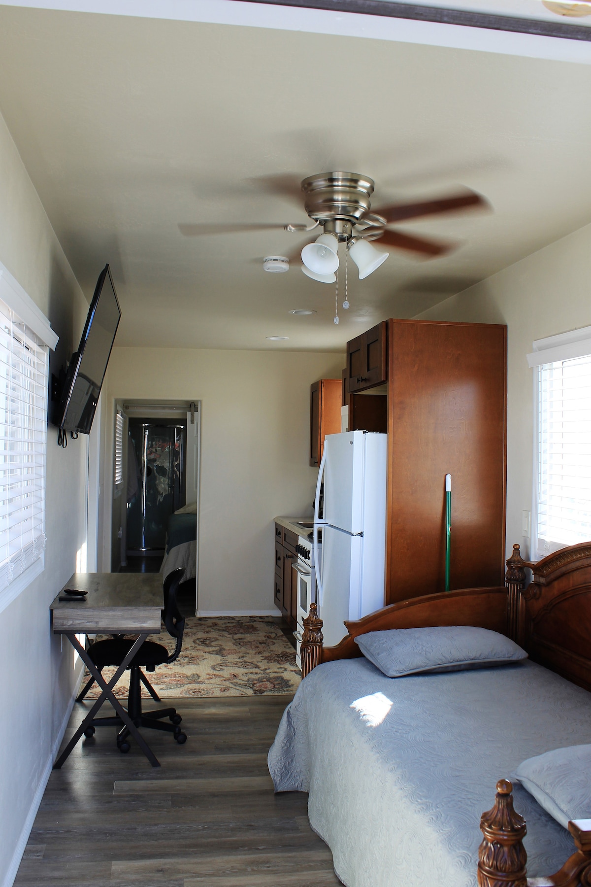 Re-purposed 40-foot shipping container w/Ikea cabinets & furniture at edge of desert. Loft is 1 of 2 dwellings on 5-acre lot, private exterior doors & adjacent reserved parking. Picture window with wonderful view of Organ Mountains. Compact kitchen, Serta PillowTop queen size bed, full bathroom, LED lighting, cooled/heated by modern heat pump, Wi-Fi Internet. Pool access in season (usually April-October). Hike/bike from doorstep. Pet-friendly, see House Rules for details/cost.