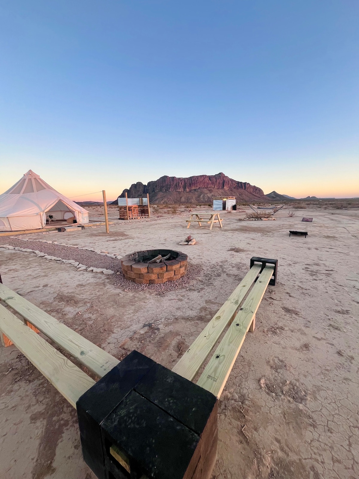 Enjoy 360° views of the desert beauty AND the comfort of a soft queen bed, hot water shower and personal charging station on our 320 acre off-grid property. ⛺️ Private tent sites 📍25 min from the Dunes, Zapata falls, Hot springs and more. You also get access to: • Shared Outdoor kitchen & dish sink • Blackstone grill & BBQ • Shared Indoor bathrooms (drive or walk) • Group & private campfires • Hammocks for stargazing WE ARE IN A DESERT So be prepared for desert weather!🏜️
