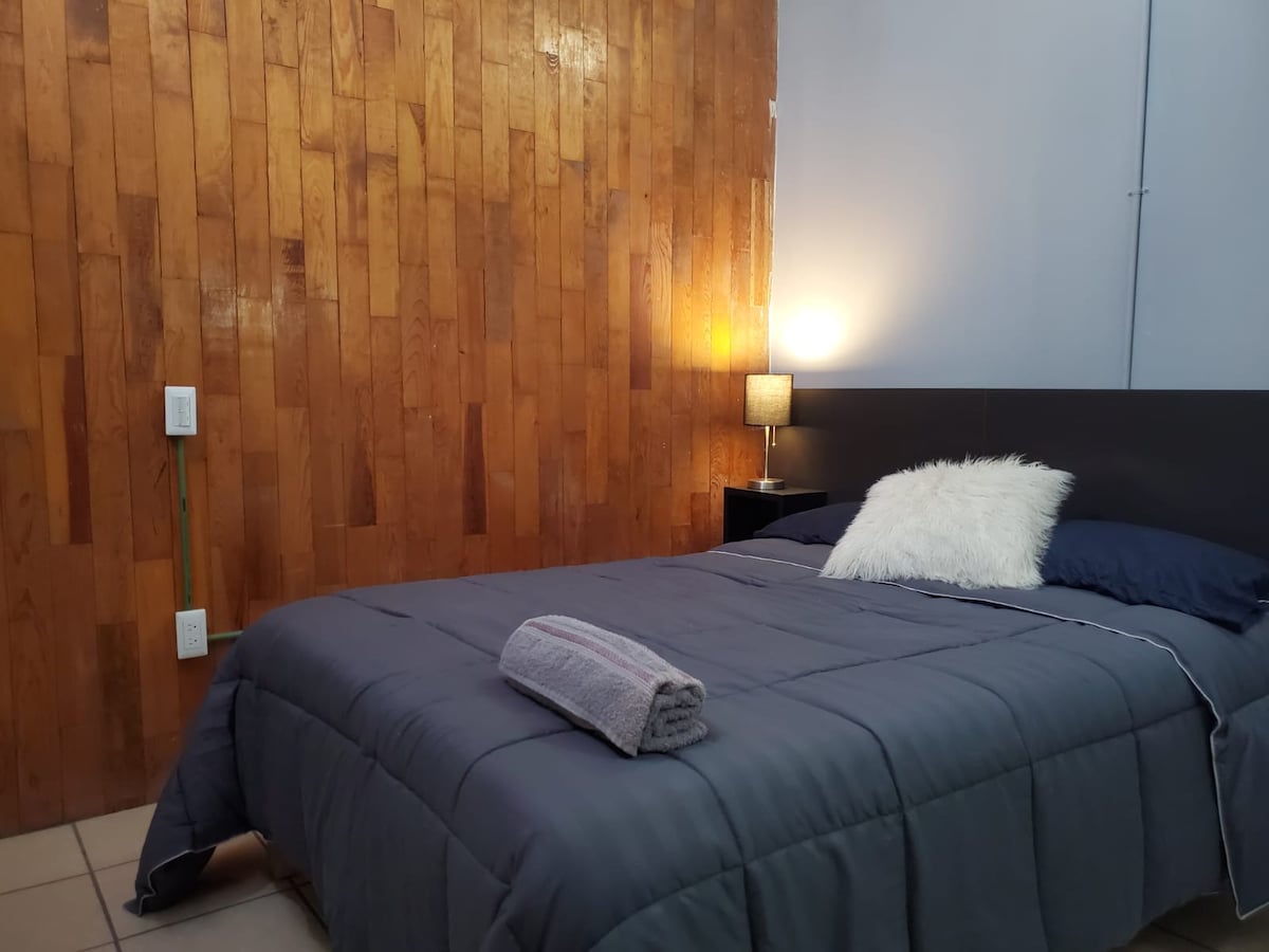 Disfruta de la sencillez de este alojamiento tranquilo y céntrico, ubicado a un costado del Panteón de Oriente, a escasas cuadras de la central camionera. Este lugar, ideal para 4 huéspedes, está rodeado de negocios de comida y centros comerciales. Cuenta con 2 confortables habitaciones: 1 con cama king size y la otra con 2 camas gemelas, ambas con enormes clósets con espejos; cocina equipada, cochera con portón eléctrico, sala con televisión, wifi y Netflix y baño con regadera.