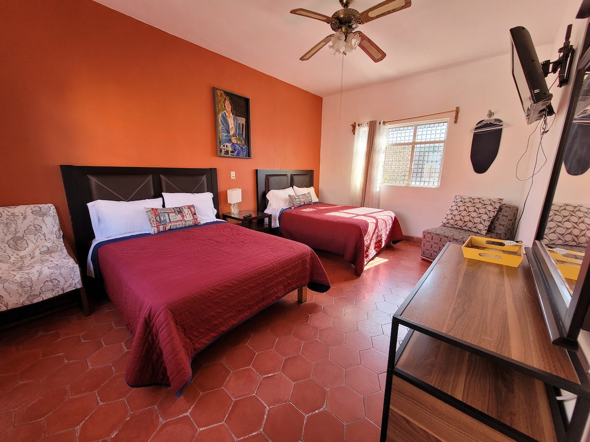 Disfruta de la sencillez de este alojamiento tranquilo y céntrico, entra a las 12:00pm del día a las 12:00pm del día siguiente, incluye área de lavado y área para cocinar, y con posibilidad de anexarse una habitación más para familia grande, el costo seria $600 la noche con habitación extra.