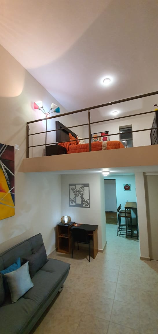 Departamento moderno tipo LOFT. Cuenta con barra de cocina, incluye: frigobar, horno de microondas, parrilla de inducción, sartenes y más accesorios. Cama matrimonial y buro. Con Smart TV, closet, patio de servicio propio con lavadero. Baño completo con agua caliente por medio de boiler solar. Escritorio con silla ejecutiva y sofá cama.