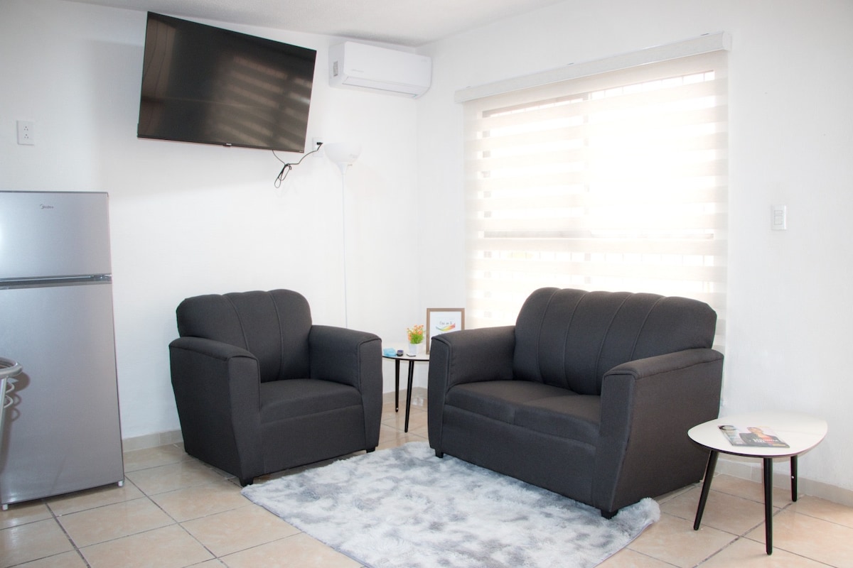 Cómodo departamento de 2 habitaciones y un baño, cuenta con un sofa cama matrimonial y 2 camas matrimoniales. Se encuentra en area céntrica con centros comerciales, cine, 10 minutos al centro en auto. El fraccionamiento es privado y cuenta con acceso controlado. Hay escaleras para subir al departamento.