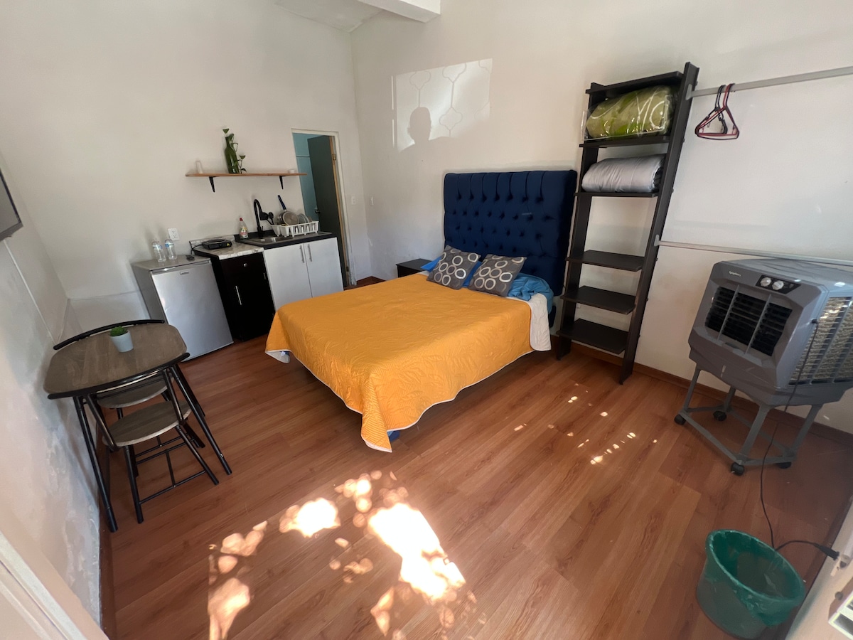 Disfruta de la sencillez de este alojamiento tranquilo en la colonia Fuentes del Sur en Torreón, cuenta con todo lo necesario para una estancia cómoda. Entrada independiente, baño dentro de la habitación con agua caliente, televisión, frigobar y pequeña barra de cocina con utensilios básicos, internet de fibra óptica y aire acondicionado (minisplit) para tu cómodo descanso.