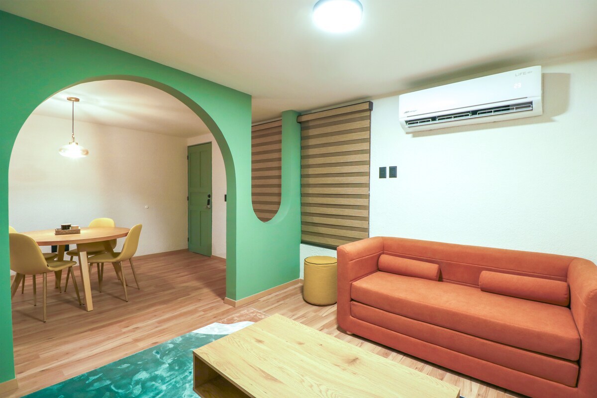 ⚠️ Nuestro Airbnb es un Departamento PRIVADO con UNA RECÁMARA con MiniSplit para UNA PAREJA cuenta con: -Cine en habitación y Alexa con Spotify Premium -TV 55' en sala con Chromecast y PS4 🎮 -🎬 HBO Max, Disney+, ClaroVideo, por nuestra cuenta. -Estacionamiento un cajón exclusivo NO TECHADO 🏁 -NO FACTURAMOS -Aeropuerto a 5 min | Central de Autobuses a 5 min -Hospitales a 7 min -Plazas Comerciales, GYM y Restaurantes 🍴 a 3 min -Oxxo y Farmacia en esquina