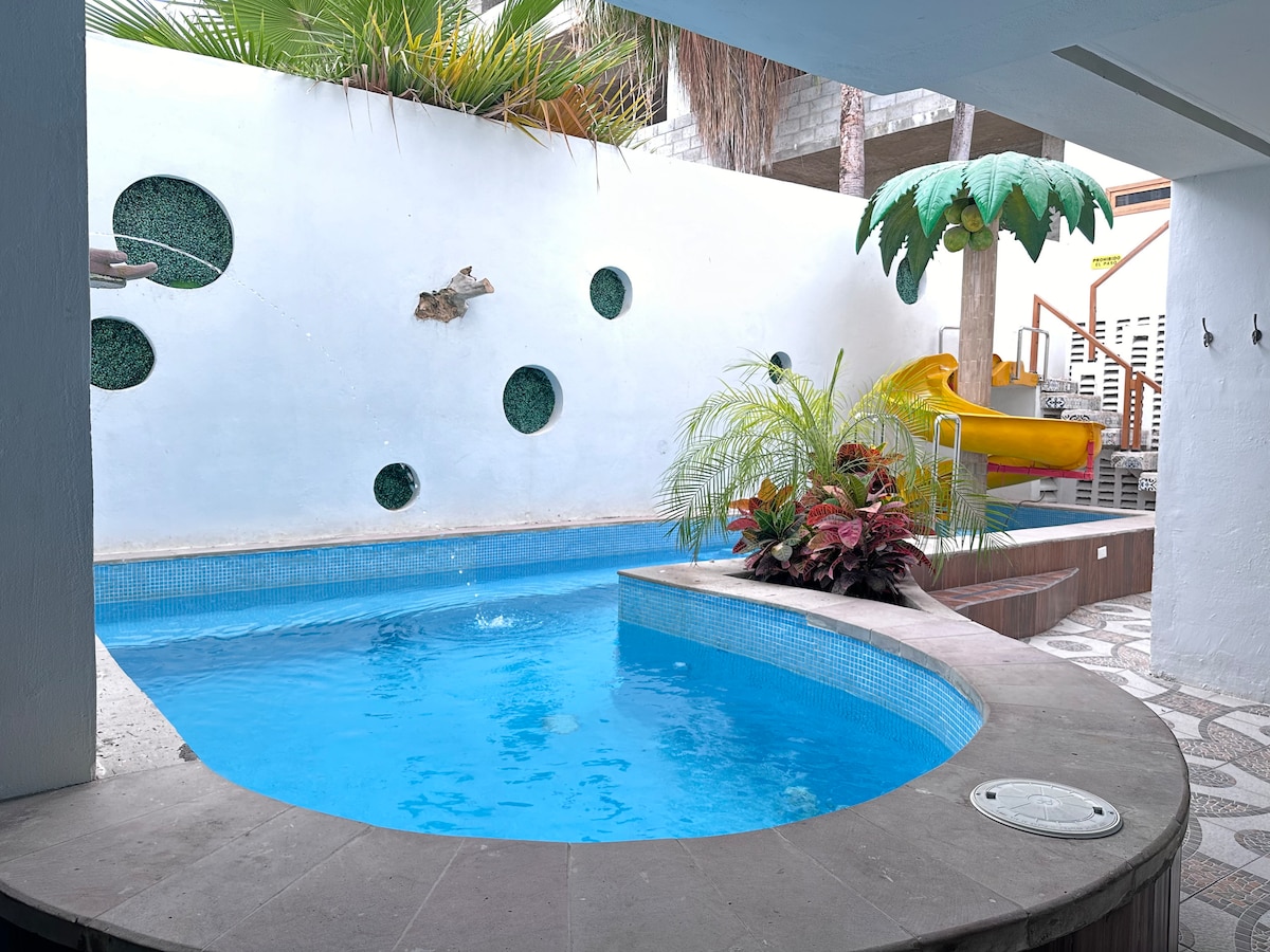 Casa Laguna is an elegant property. It includes beautiful common areas such as the teraza overlooking the Laguna or our pool with a waterslide. Centrally located and a 2 minute walk to the beach, 4-minute walk to La Gran Plaza shopping mall that includes a casino, movie theatre and many more shops and restaurants, 7-minute walk to the stadium where baseball is played, 5 minute walk to Parque Central or Mazatlan's new aquarium, 13-minute walk to the gold zone and 9-minute drive to the downtown.