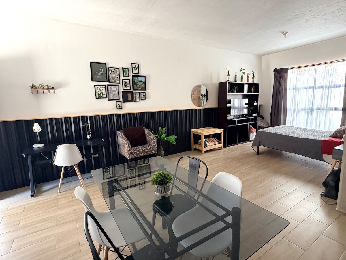Relájate en este espacio tan tranquilo y elegante. Acogedor alojamiento entero de una recámara para dos personas. Cuenta con pantalla Smart y Netflix, Disney +, wifi, estacionamiento gratuito, agua caliente 24/7, utensilios de cocina, refrigerador, parrilla a gas, microondas, agua potable, dentro de un residencial privado con vigilancia las 24 horas. En el tercer piso en una de las zonas mejor ubicadas y conectadas de la ciudad. A un costado de supermercados, restaurantes y plazas comerciales.