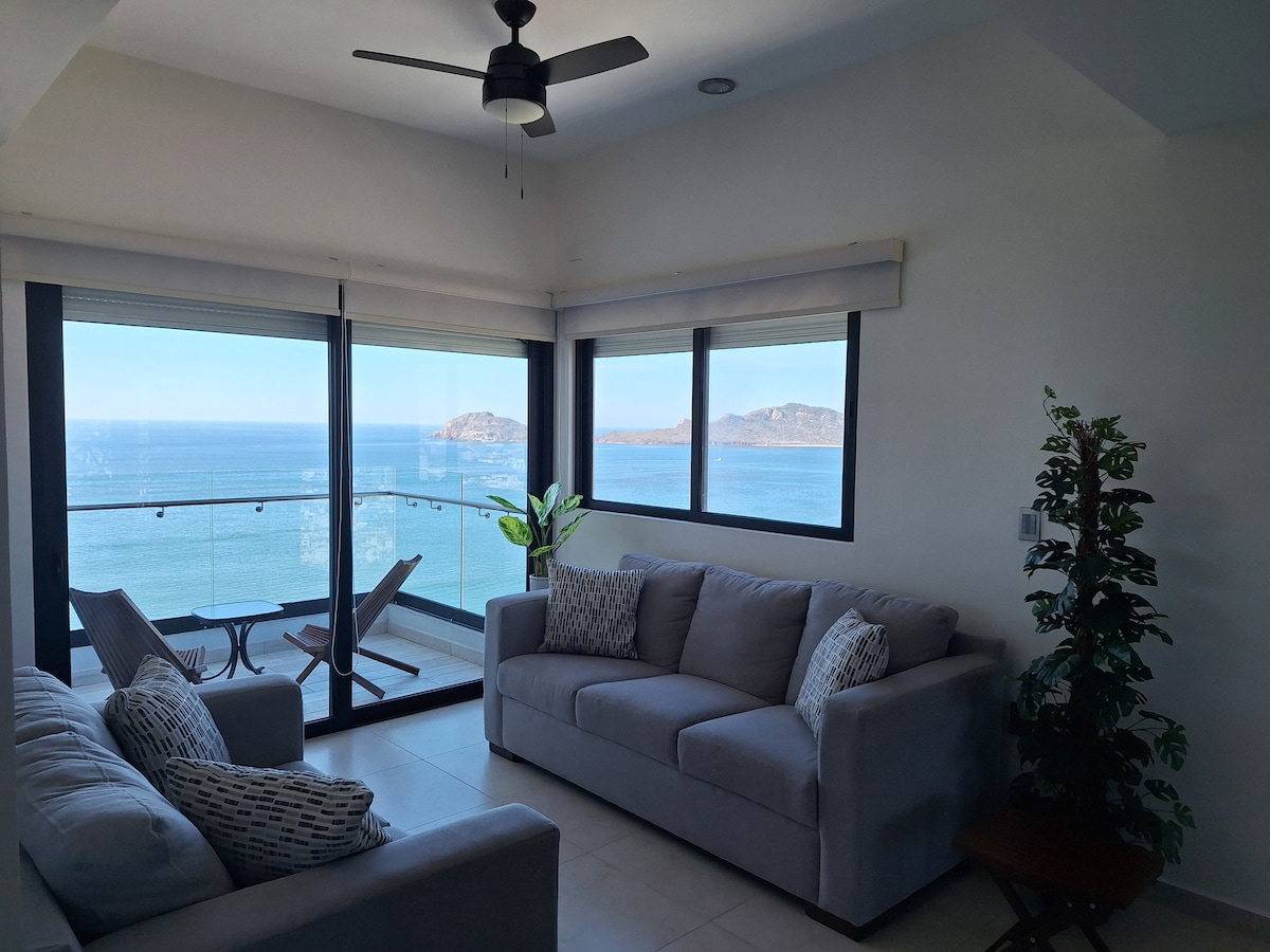 Vertical condo on the 9th floor, 2 bedroom corner unit with wrap around walkway balcony/ocean view from anywhere in the condo (except bathrooms). In front of Torre Eme condominiums you will discover the 13 mile family-friendly malecón, you can enjoy walking, jogging, bike ride simply watching the sunset. It is centrally located, walking distance from Olas Altas, Centro Histórico and the Golden Zone. The views are incredible, with a lookout into the pacific and Mazatlan’s famous 3 islands.