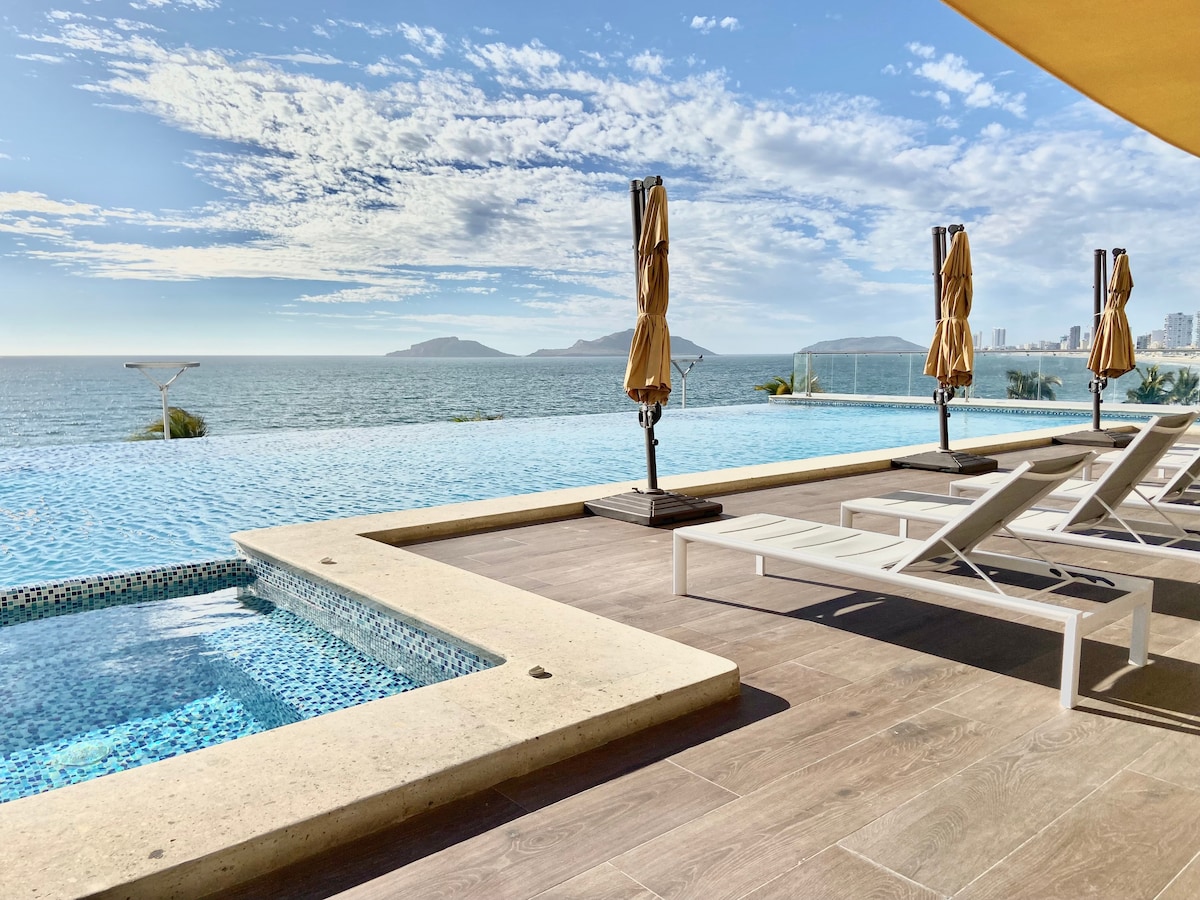 Experience Mazatlan from the heights in this exclusive apartment. Enjoy luxury finishes, 2 bedrooms with queen size beds and TV, a spacious living room with oceanfront balcony and a fully equipped kitchen. It also has a spectacular rooftop pool. Located in front of the Malecon and just steps from the Golden Zone, you will have immediate access to beaches, restaurants and nightlife. Ideal for those looking for comfort, incredible views and an unbeatable location.