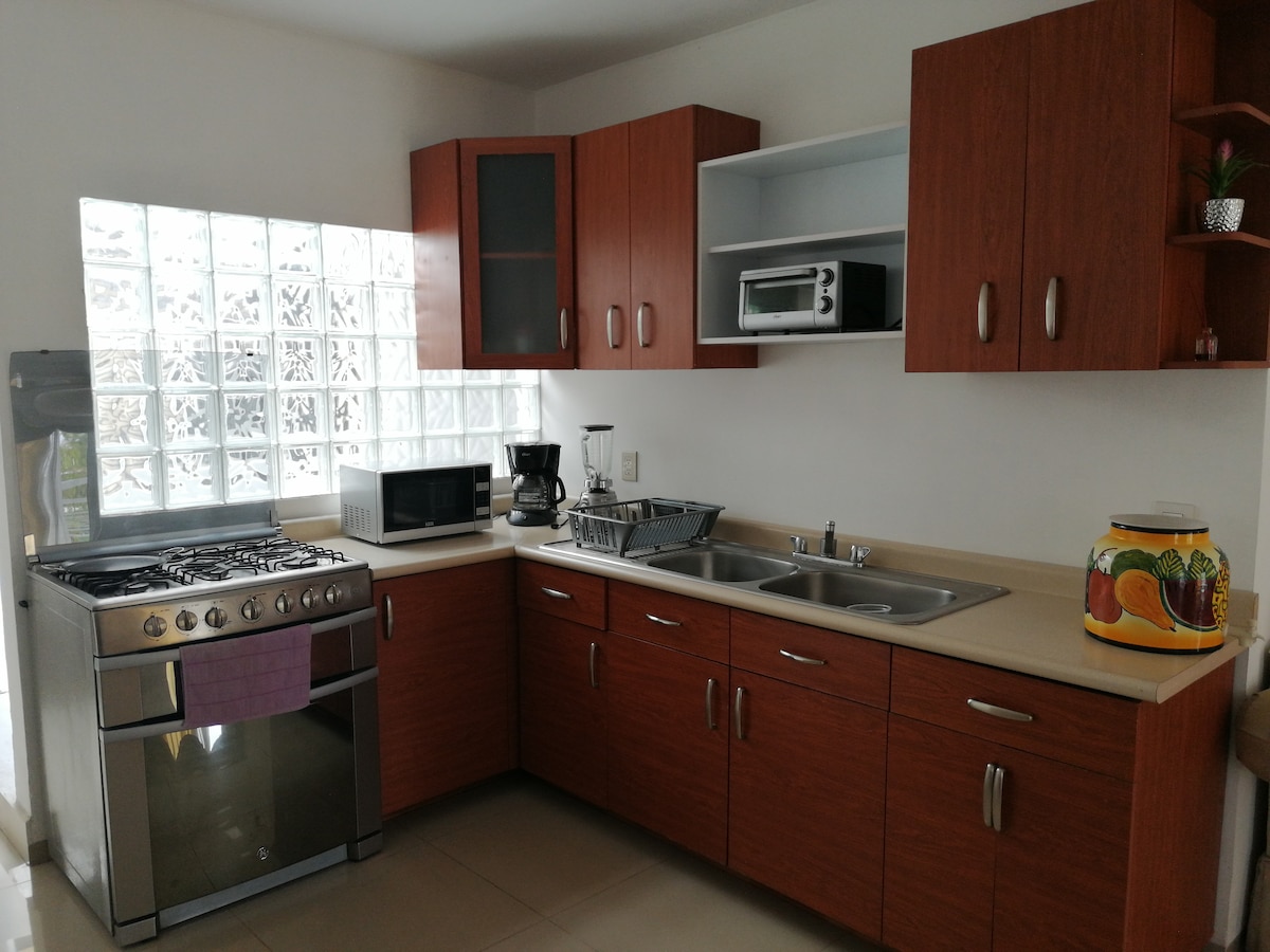 Departamento en planta baja cuenta con dos habitaciones con camas matrimoniales, patio,cuanto con baño completo con toallas,papel, jabón, cuenta con cocina con: refrigerador, microondas, parrilla; comedor, sala con televisión; cuarto de lavado con lavadora y secadora; un cajón de estacionamiento, fraccionamiento privado con vigilancia las 24 hrs un lugar muy tranquilo