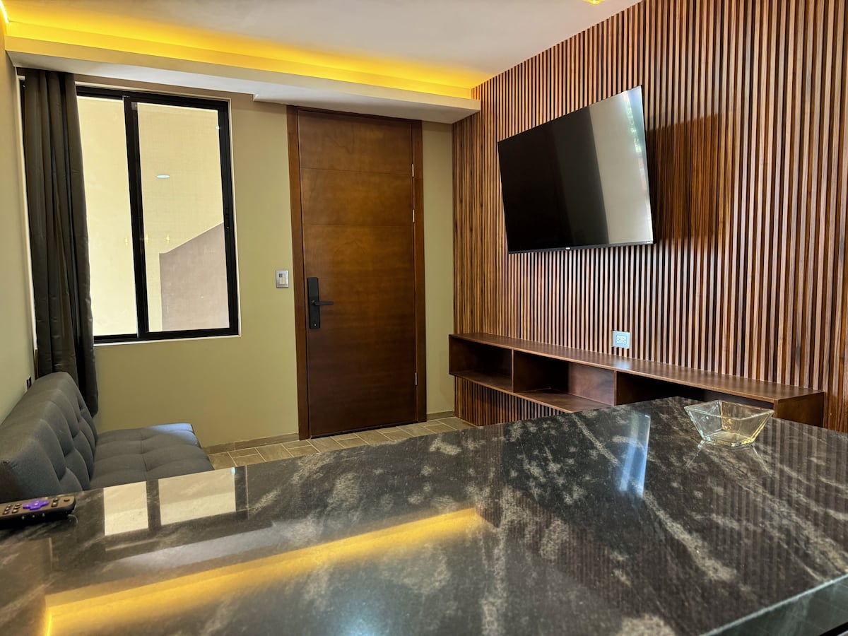 Departamento moderno tipo LOFT. Cuenta con barra de cocina, incluye: frigobar, horno de microondas, parrilla de inducción, sartenes y más accesorios. Cama matrimonial y buro. Con Smart TV, closet, patio de servicio propio con lavadero. Baño completo con agua caliente por medio de boiler solar. Escritorio con silla ejecutiva y sofá cama.