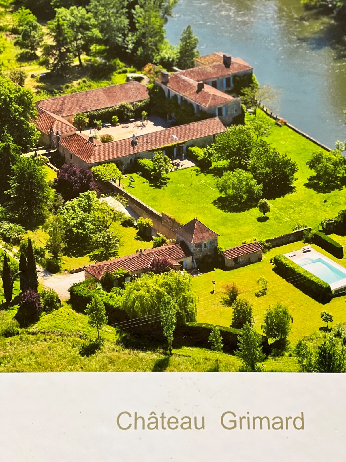 Chateau Grimard was built at the end of the 13th century and is immediately next to the River Lot . It is set amongst vineyards and sunflower fields, with 8 hectares of land all which can be used by guests. The Chateau has 3 gites, all of which have sufficient privacy. Guests can swim in the river, kayak, and there is also a large shared salt water swimming pool. Wifi. The historic town of Puy L’Eveque is five minutes drive away.