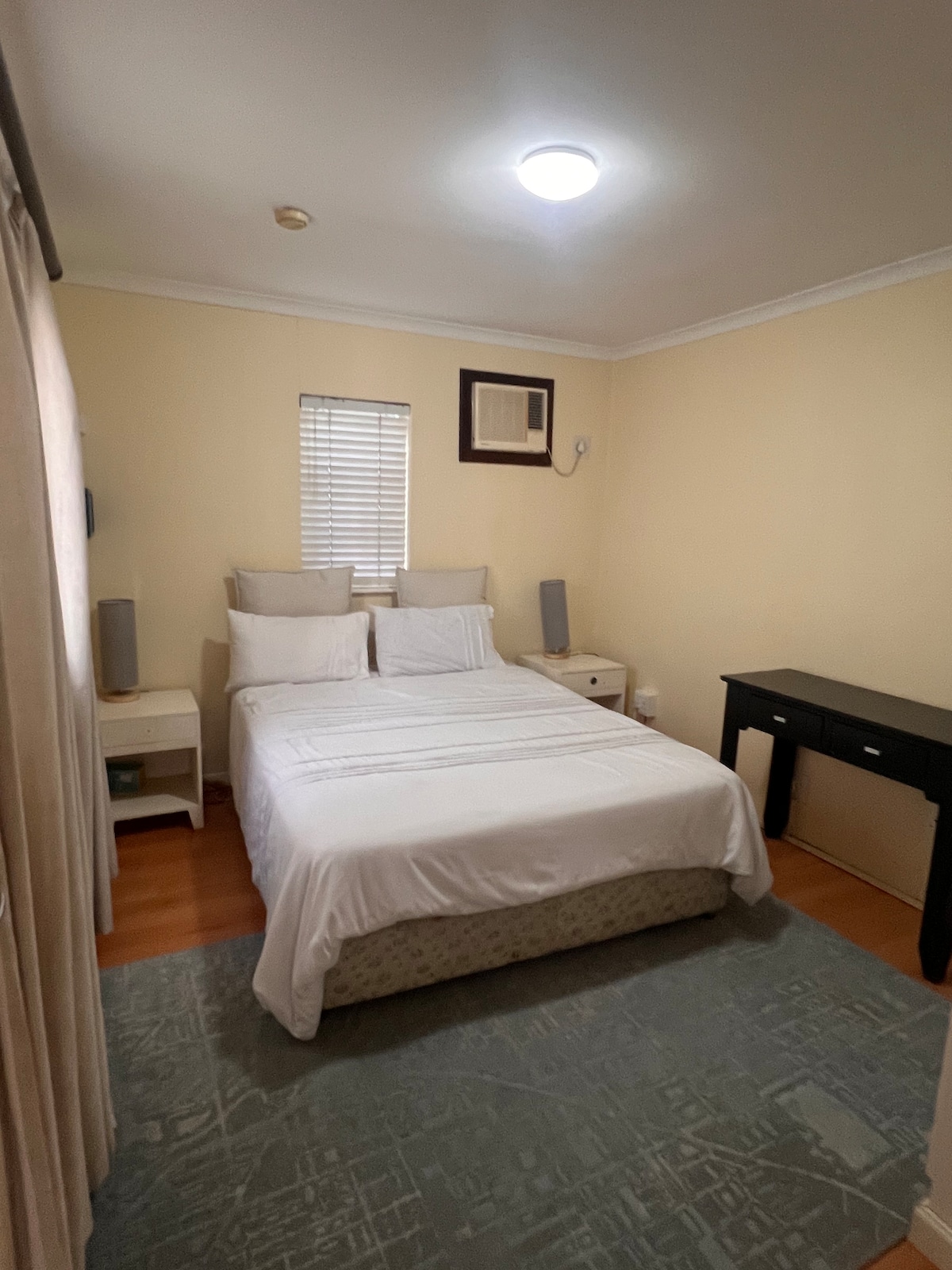 Private..Recently renovated. Parking garage (remote operated). Incredibly central for all activities in Durban (5 minutes to beach, stadium, Florida rd)…Walk to restaurants. Fully equipped kitchen, double bed with aircon, Wifi, tv with Disney+. Inverter for loadshedding. Solar powered geyser=amazing shower. Separate changeroom&workstation. Beautiful private outside area filled with fruit trees/shade. (For + 4 days: Room serviced every 4 days. Personal washing on request)