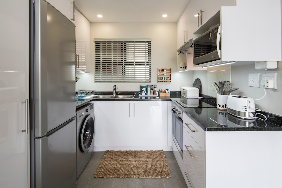 Located in a quiet, access controlled cul de sac this upstairs maisonette has spectacular views from the outside deck. This is an upstairs unit above the main house, with 13 steps walk up access. The private entrance with allocated parking, gives you privacy and peace of mind. The ensuite bathroom has access to a very spacious and comfortable bedroom with a queen sized bed. There is a separate open plan lounge/dining/kitchen area. The lounge has a sleeper couch for the kids.