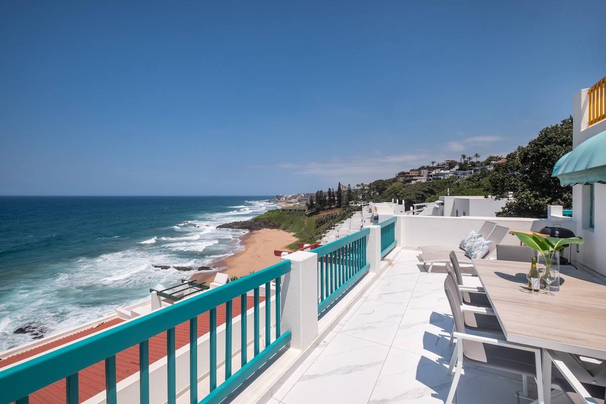 Treat yourself to the ultimate luxury beach holiday in this spacious 4 bed, 4 bath villa on an exclusive & safe private beach, right next door to Ballito's iconic Willards beach. Unwind within opulent modern spaces, where every room flows onto enormous balconies surrounded by beach sights and ocean sounds. Enjoy the benefits of being located within the Santorini estate including uninterrupted electricity (no loadshedding), direct beach access. pools, kids playgrounds. high security and more.