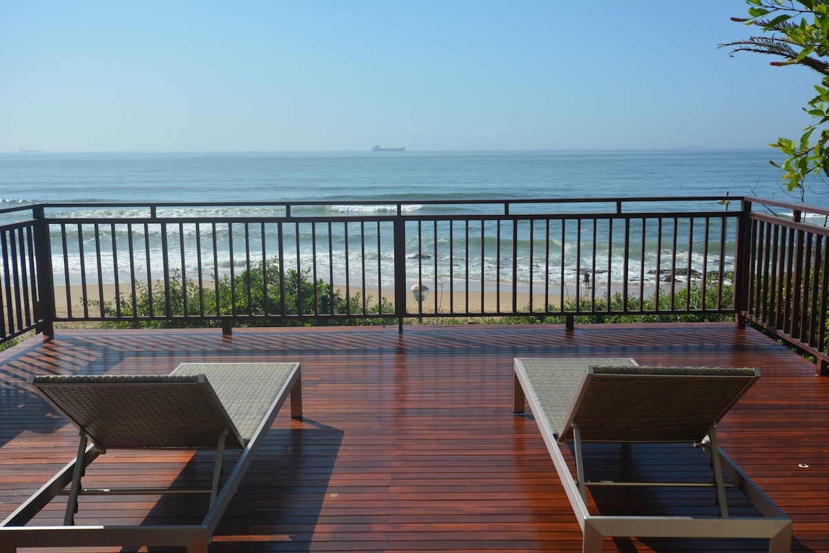 Beautiful and spacious, self-catering serviced apartment on life-guarded Bronze Beach in Umhlanga with a large deck to watch the waves breaking and creeping onto the sand right in front of you. WiFi, DSTV, a gas braai, outside dining area with sun loungers on the deck, aircon and fans keep the apartment cool and comfortable. Direct access onto the promenade and walking distance to Umhlanga Village, shops and restaurants. There is undercover parking, a complex pool, and a laundry service.