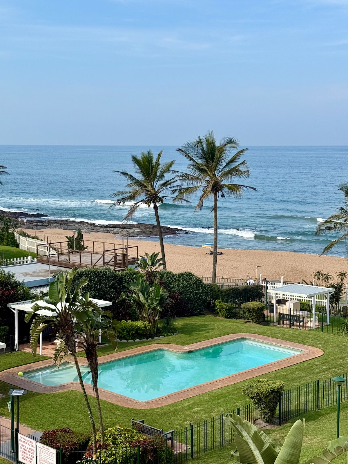 This stylish unit is OPPOSITE the popular UMDLOTI BEACH! Inverter for power cuts available. Wake up to the sunrise & dolphins frolicking in the ocean. The apartment is a 5 min walk from a stretch of restaurants & has a communal pool. It has a King size bed & 1 sofa couch (for a child) The views are to die for. Fall asleep to the therapeutic sounds of the ocean. 10 mins from the airport,umhlanga or ballito. No parties allowed. Please note there are a few flights of stairs to the unit.