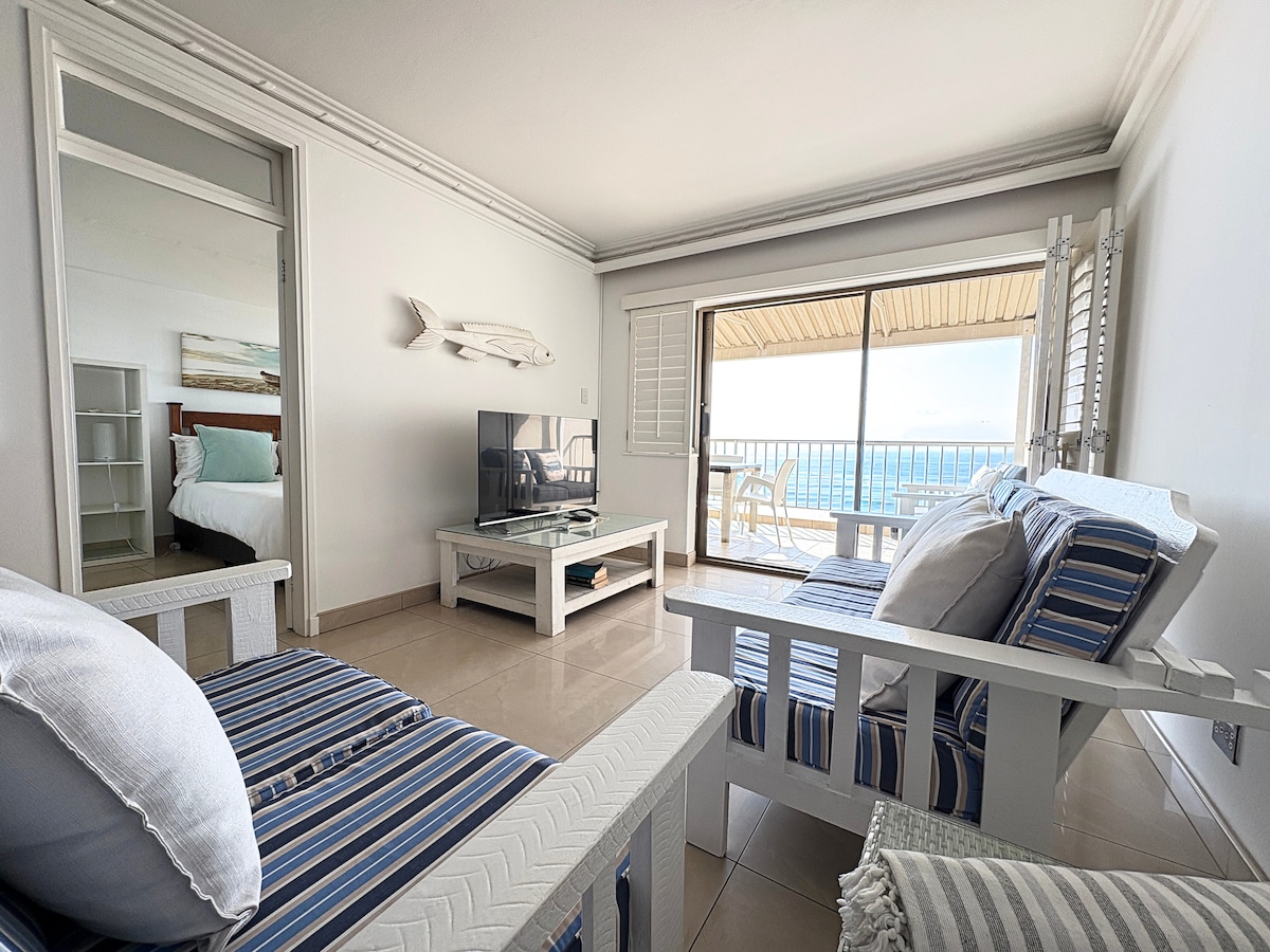 A studio apartment with lovely sea views... This flat has a breath taking view all the way to Durban. It has a 48 smart tv with Netflix. It has both a ceiling and free standing fans. The large windows that slide open allow for an awesome view. This unit is directly above the bathing beach and the rock pool. This unit also comes with uncapped WIFI. Towels, coffee, tea are also included. You literally just need to bring your clothes.