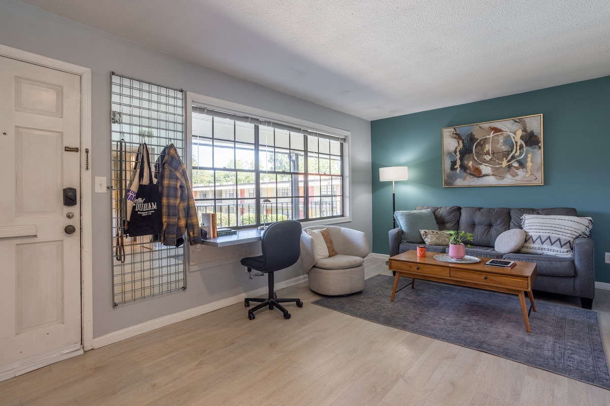 This unit is located on the second floor. Cute and comfy one-bedroom with parking! Located in a great 'secret garden' community downtown. Close to Duke campus and Duke Medical. Walk to all of the fun Durham has to offer. This apartment was refurbished in 2023 and is designed to maximize your comfort. Includes a cushy king bed, a comfy daybed, and a well-stocked kitchen. Perfect for long or short stays. This is not just another corporate AirBnB. We want you to love your stay!