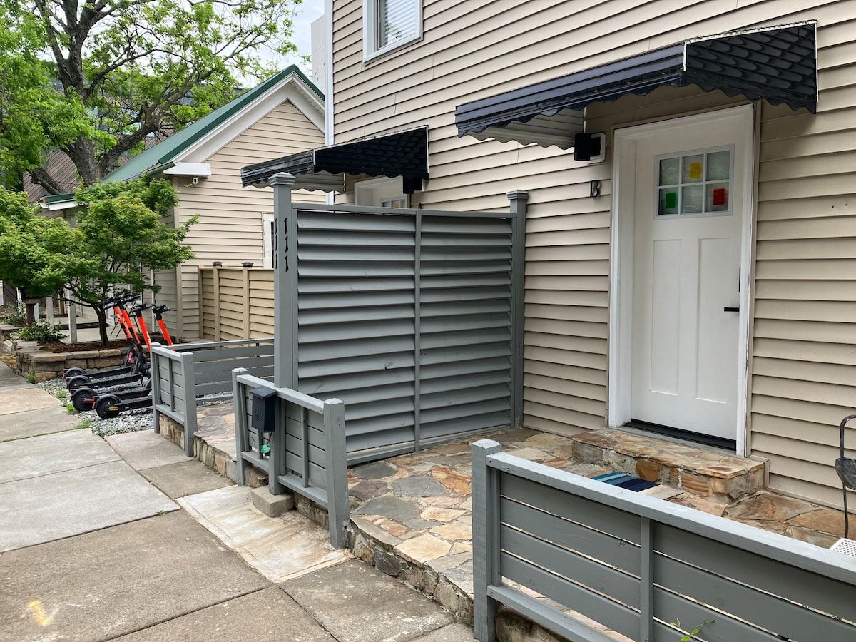 Compact studio steps from Downtown Durham with a private entry and free street parking! Well-stocked kitchenette and bathroom. Close to Duke and walkable to all of Downtown and more: ✦ 7+ coffee shops ✦ 10+ breweries ✦ Plenty of restaurants + bars ✦ DPAC, Durham Bulls + Durham Convention Center ✦ Central Park, Farmer's Market + Durham Food Hall ✦ Ellerbe Creek + American Tobacco Trails We live in the townhouse above the studio and are happy to assist with anything you might need.