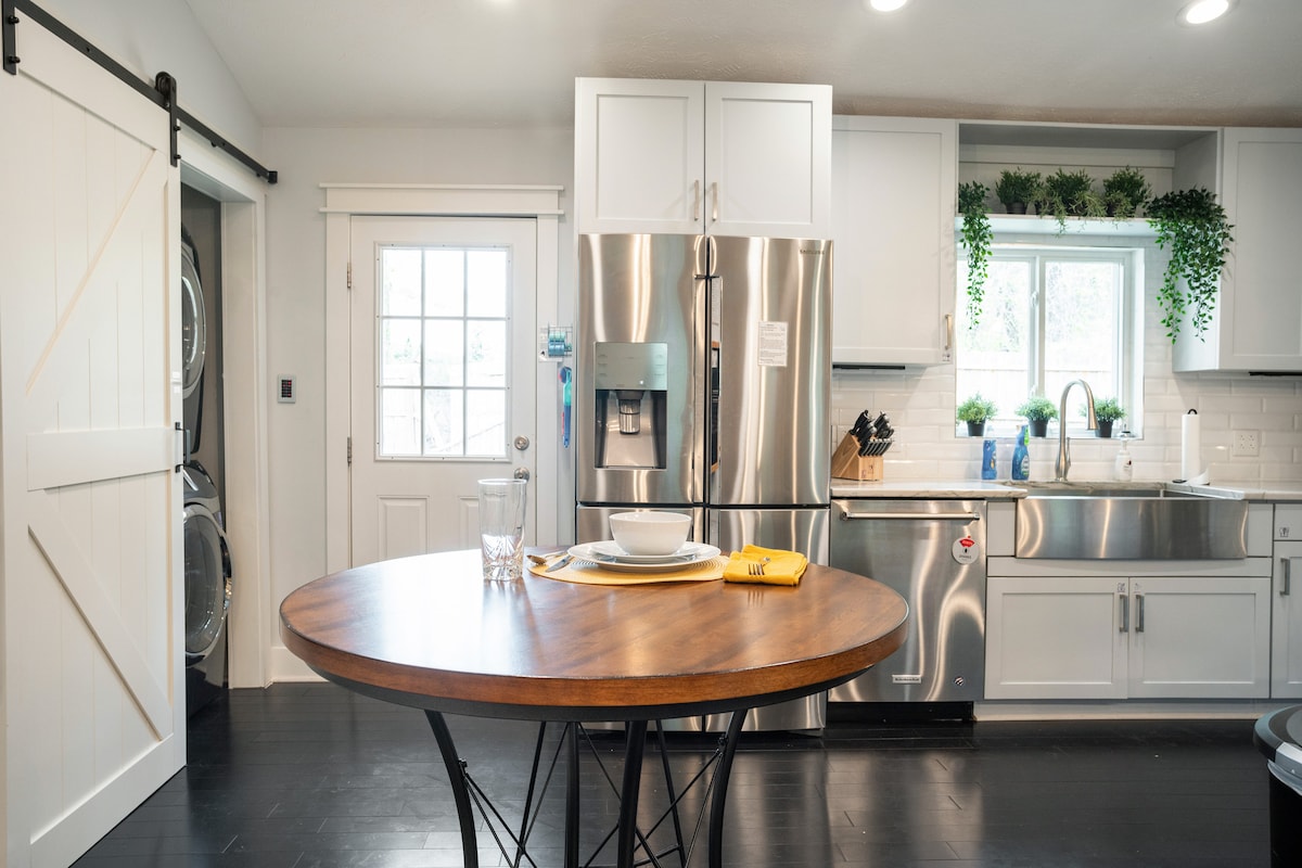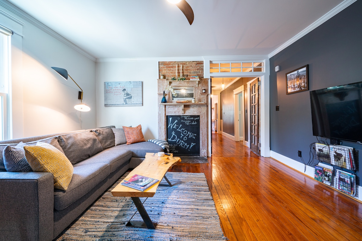 Make unforgettable memories in this spacious, beautifully designed home for you + 9 guests! Perfect for family gatherings, sporting events, & special occasions. Located in heart of Downtown Durham, just 4 mins from Duke, Bulls stadium, DPAC, & Tobacco Trail. Cozy up around the fire pit, enjoy a BBQ, or relax w/fresh popcorn & vinyl records. Retire in luxurious beds + sheets & head to the gourmet coffee bar in the AM. Free access to nearby gym w/pool. 4 air mattresses and EV charger avail.