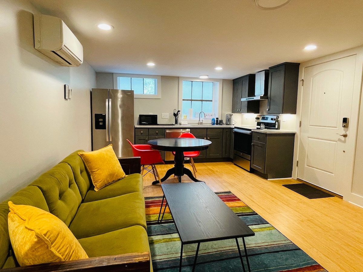 Compact studio steps from Downtown Durham with a private entry and free street parking! Well-stocked kitchenette and bathroom. Close to Duke and walkable to all of Downtown and more: ✦ 7+ coffee shops ✦ 10+ breweries ✦ Plenty of restaurants + bars ✦ DPAC, Durham Bulls + Durham Convention Center ✦ Central Park, Farmer's Market + Durham Food Hall ✦ Ellerbe Creek + American Tobacco Trails We live in the townhouse above the studio and are happy to assist with anything you might need.