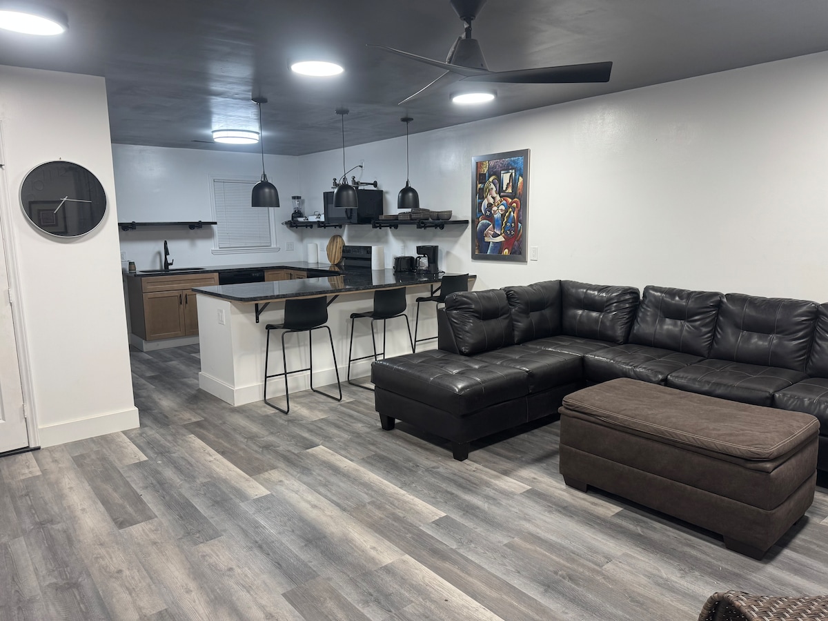 4-bedroom, 2-bath home is perfect for families, friends, or business travelers. The highlight is the large, private, fenced-in backyard—designed for relaxing evenings and fun gatherings. Enjoy the putting green, picnic area, fire pit, grill, and spacious furnished porch, all illuminated with cozy string lights Available parking lot in back or driveway. Inside, the home features: A fully equipped open kitchen Smart TVs with fast Wi-Fi Washer and dryer Stocked bathrooms with soap and shampoo