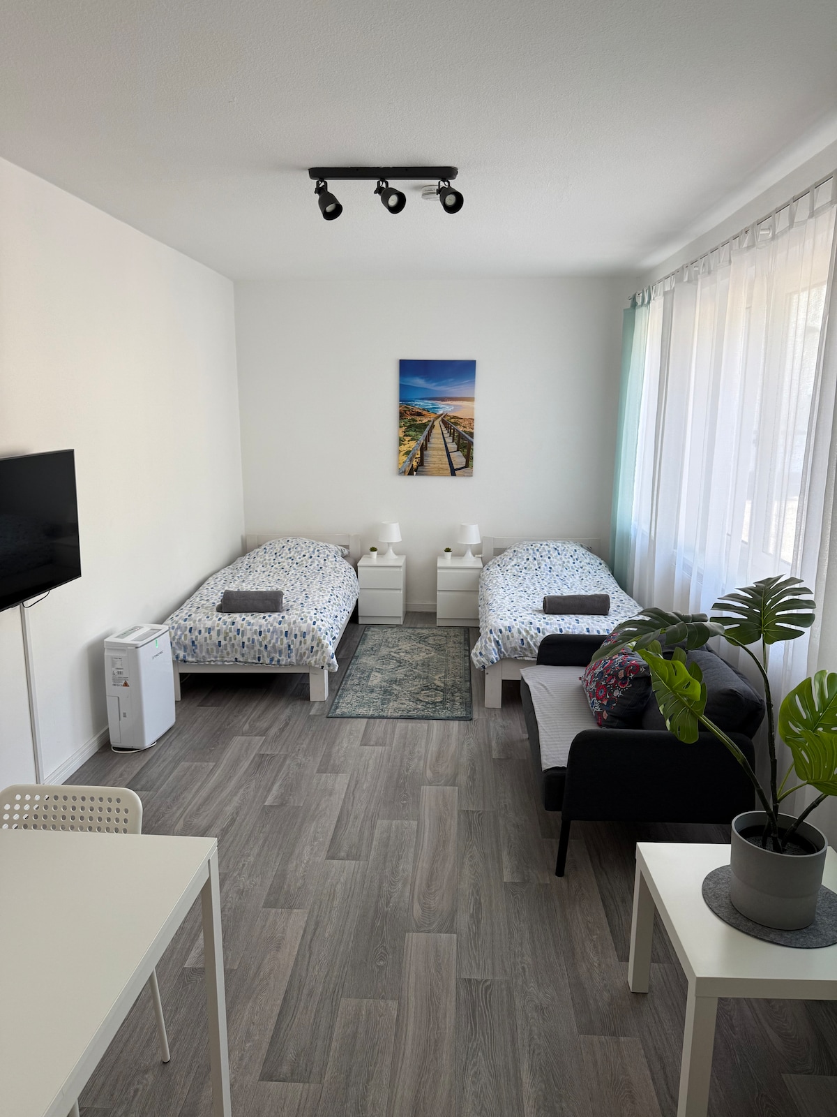 Herzlich Wilkommen in unserer stilvoll eingerichteten Wohnung. Sie ist voll ausgestattet und bietet mit einem Doppelbett, zwei Einzelbetten und einer Schlafcouch Plaz für bis zu 5 Personen. Die Küche ist voll eingerichtet und kann nach Bedarf genutzt werden. Sie zeichnet sich außerdem durch die Nähe zum Flughafen Baden-Airpark aus und ist gut an die öffentlichen Verkehrsmittel angebunden. Die Umgebung bietet außerdem verschiedene Freizeitmöglichkeiten.