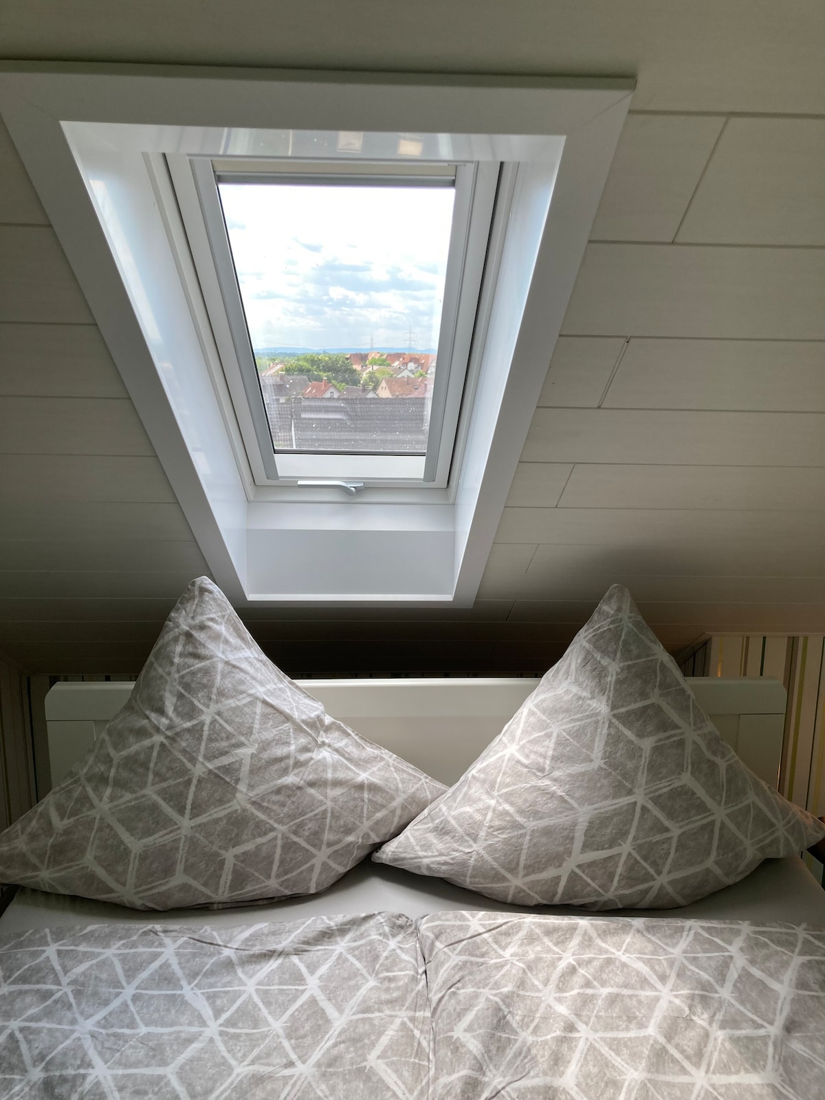Accommodation "Bettina" for 1 to 3 People. For 1 Person a single bed in the living room. For 2 or 3 persons there´s an extra bedroom with a double bed 160/200cm available. A modern, light flooded, spacious and comfortabel attic flat. Living room with a single bed, a fully equipped kitchen. Bedroom and a bathroom . The flat is on the 3rd level in a private house. In Rheinstetten close to Karlsruhe. key compartment, free parking on the street. Garage for bycicles or bikes.