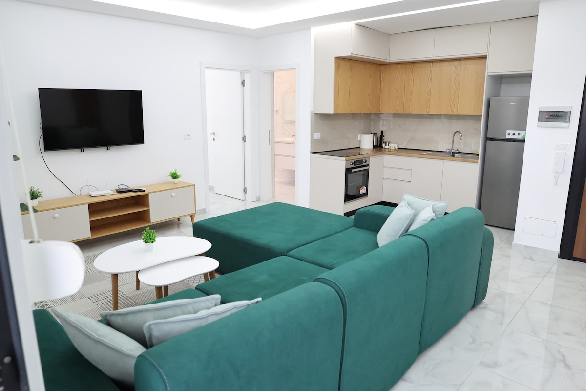 Stylish, bright apartment with designer renovation in the best area of Durrës — just 100m from the sandy beach. Ideal for a romantic escape or solo trip. Features a private balcony, full kitchen, AC in both rooms, elevator with private chip, and secure parking. Close to cafes, restaurants, markets, and ancient ruins. Enjoy comfort and tranquility year-round — whether for a weekend getaway or a longer stay.