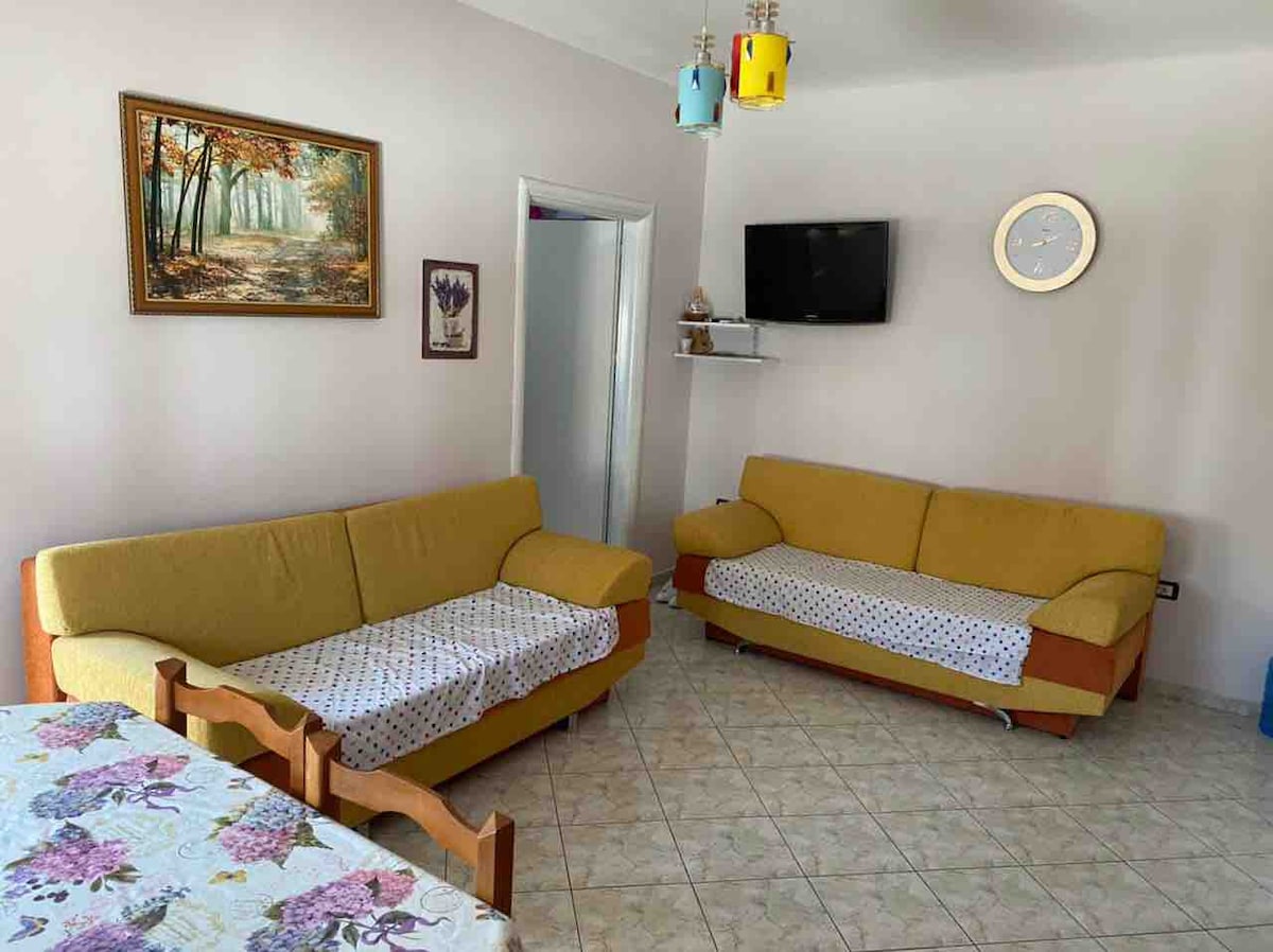 Charming two-floor beachside villa just steps from Golem’s shore—perfect for families or groups. Relax in a tranquil garden, dine outdoors at the shaded table, or fire up dinner on the built-in barbecue. Inside welcomes open living and kitchen space, plus a cozy room with sofa bed and bath on the first floor. Upstairs: three bedrooms (one with a spacious balcony). Fully equipped—kitchen, appliances, linens, hairdryer, iron—and free on-site parking.